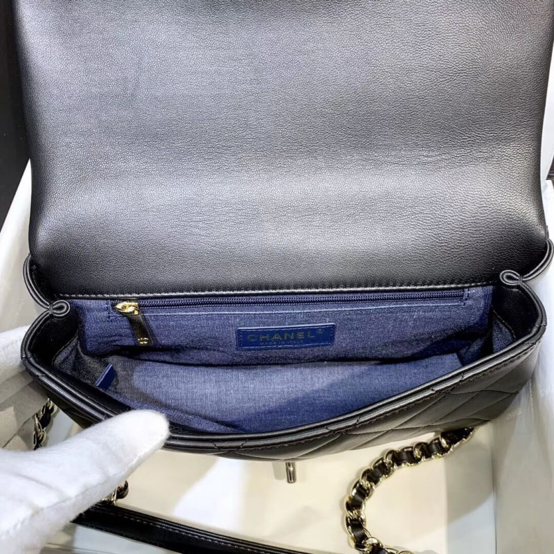 The new version has much a softer tone, and it feels smoother. It also features the same lambskin appeal like the Classic Bags. The CC smooth CC logo including the woven chain leather strap are both stunning too. Then zoom further in. The large gold chain is partly colored, with the same shade as the body of the bag. The back comes with a back pocket but can be closed with what-seems-to-be a snap button.