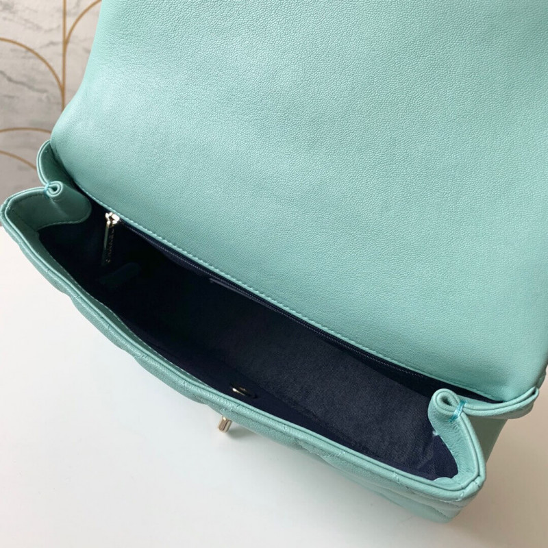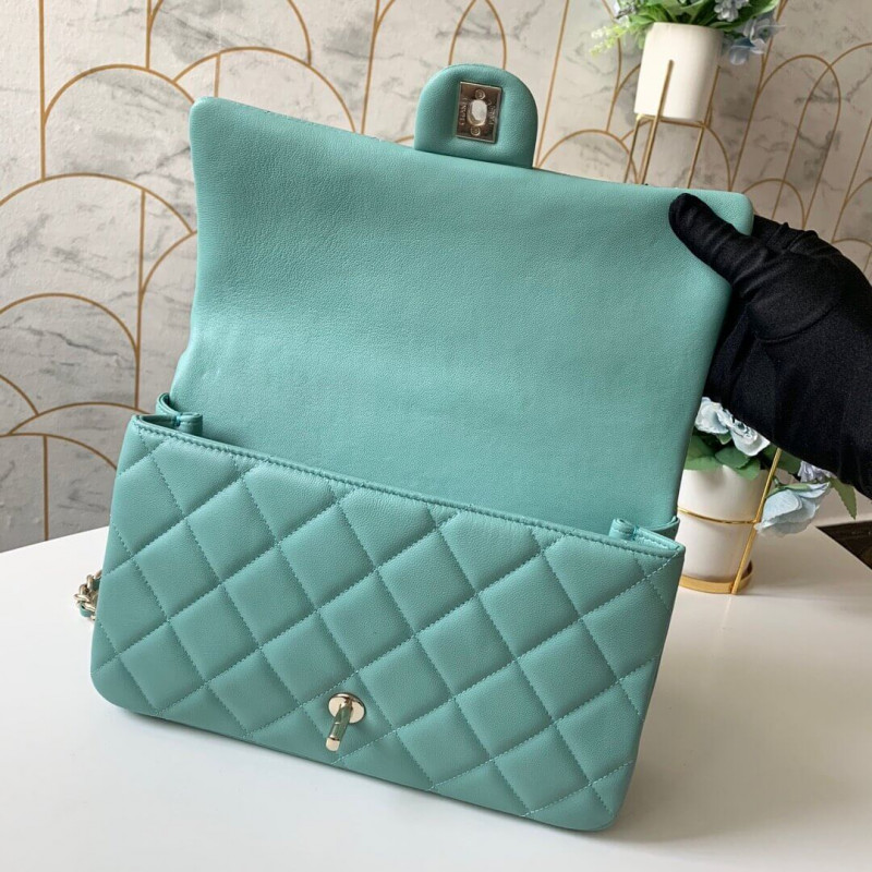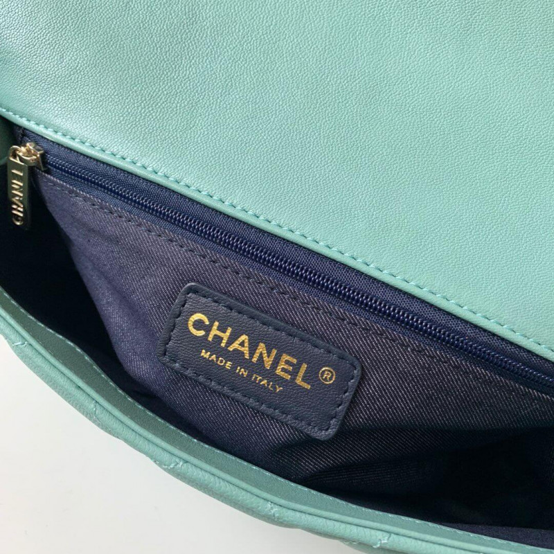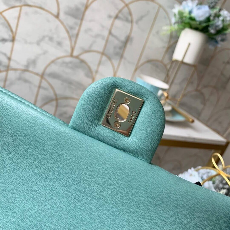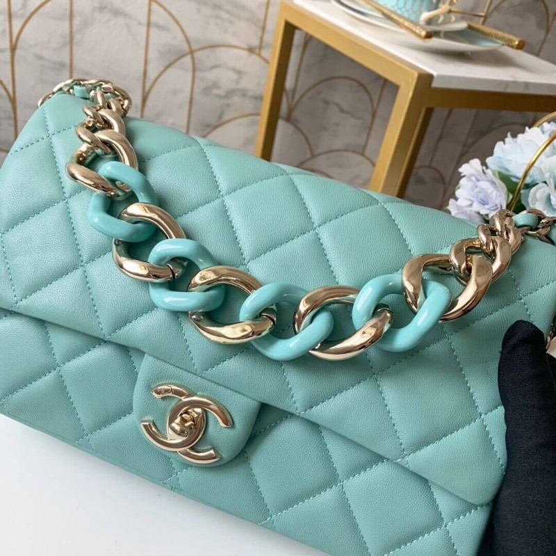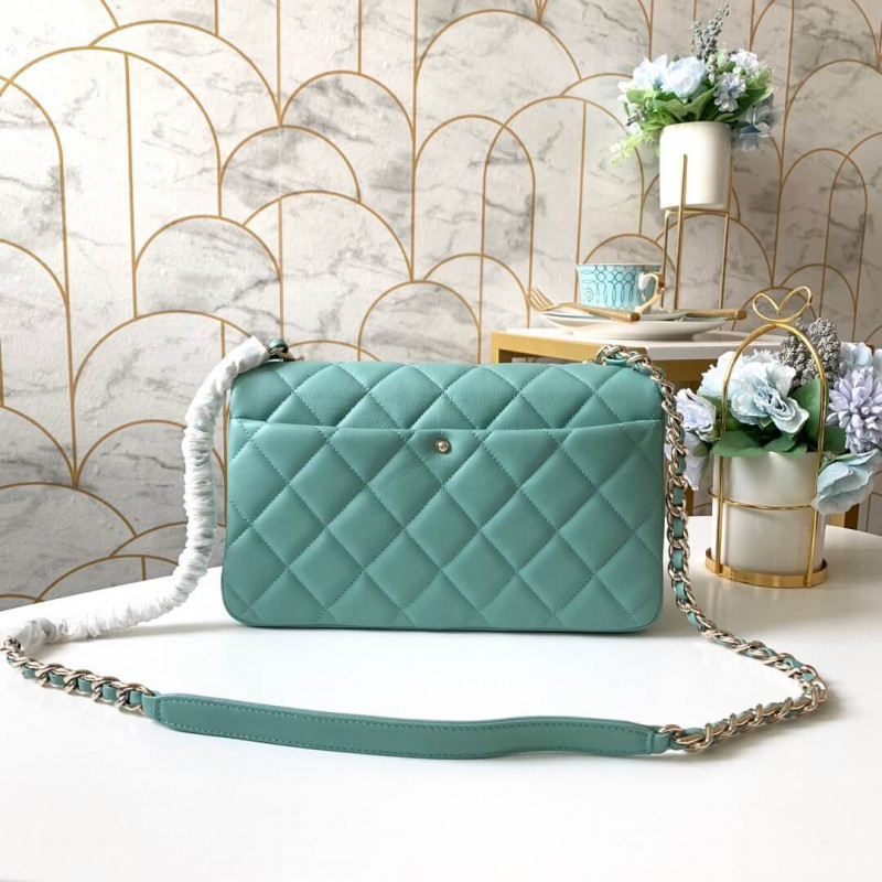 The new version has much a softer tone, and it feels smoother. It also features the same lambskin appeal like the Classic Bags. The CC smooth CC logo including the woven chain leather strap are both stunning too. Then zoom further in. The large gold chain is partly colored, with the same shade as the body of the bag. The back comes with a back pocket but can be closed with what-seems-to-be a snap button.