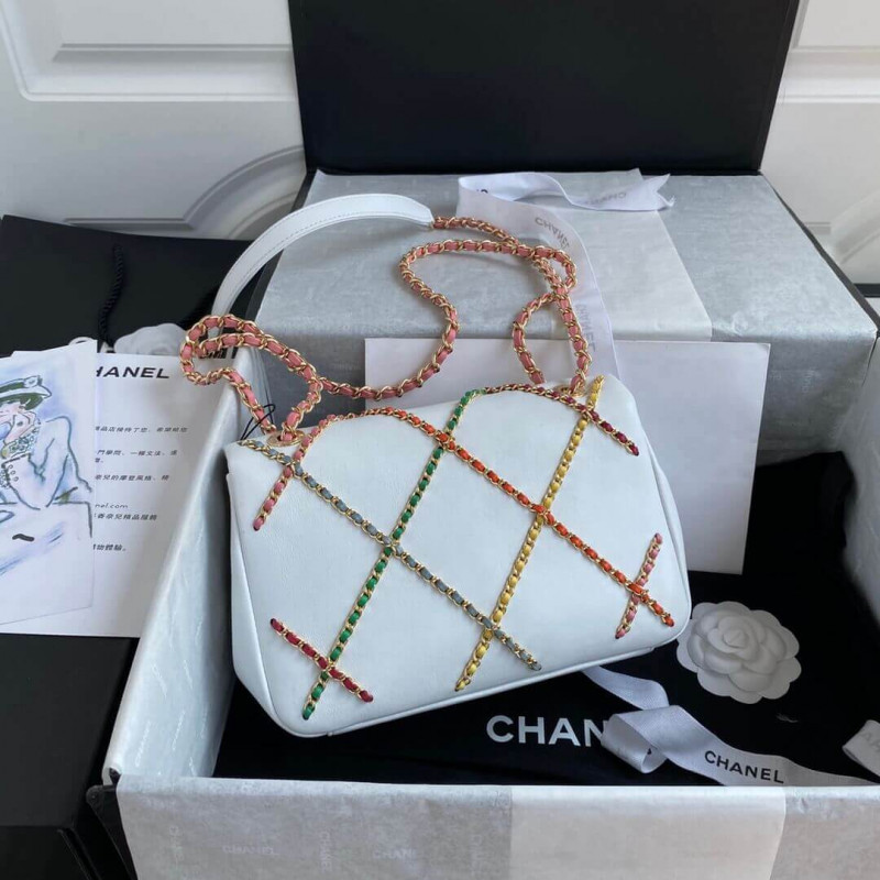 The woven chain link has been reinvented. Chanel made them smaller and cover them all over the body of the bag to create the iconic diamond pattern. They mix the chains with different colors like purple, pink, yellow and baby blue to make them eye-catching.