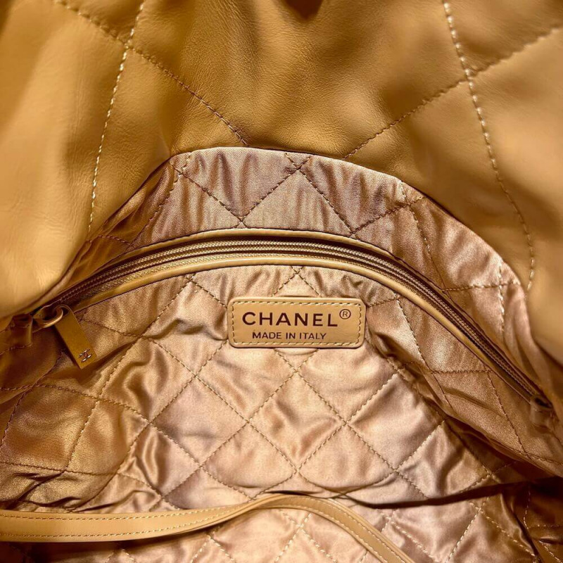 - Camel Metallic Calfskin leather strap with interwoven chain detail