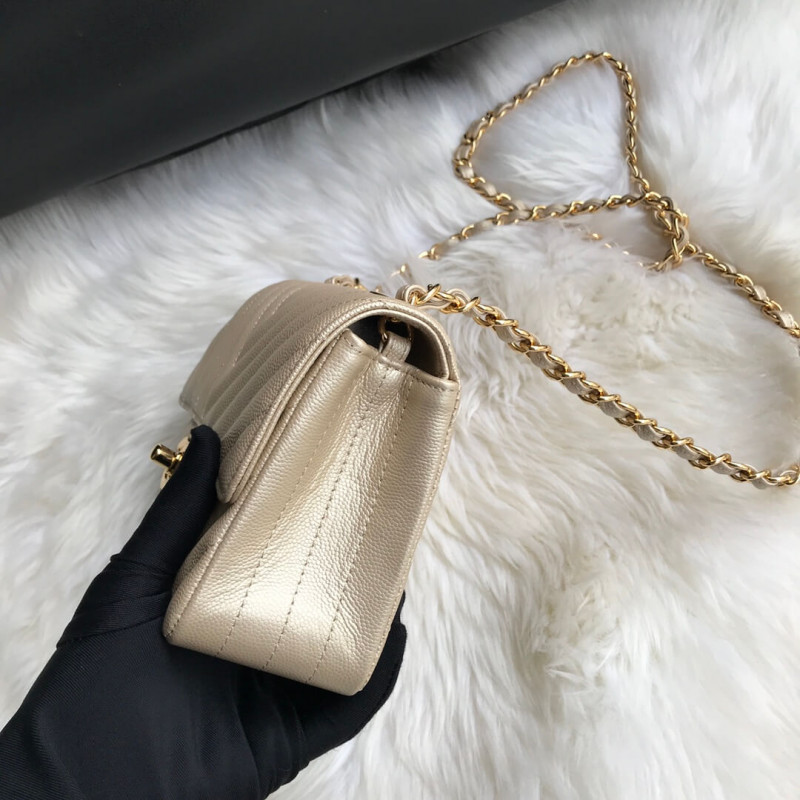 Chanel classic bags are made up of its quilted material but for this particular Mini Chevron Classic Flap Bag, it is a queen bag on its own with its Chevron quilted material, which by the way is a modern print on Chanel’s classic bag. The Mini Chevron classic flap bag version is ideal for women who doesn’t like to carry too much stuff with them so a small mini bag is their best bet.