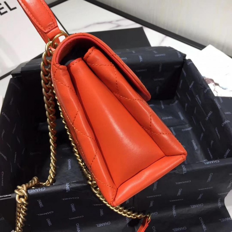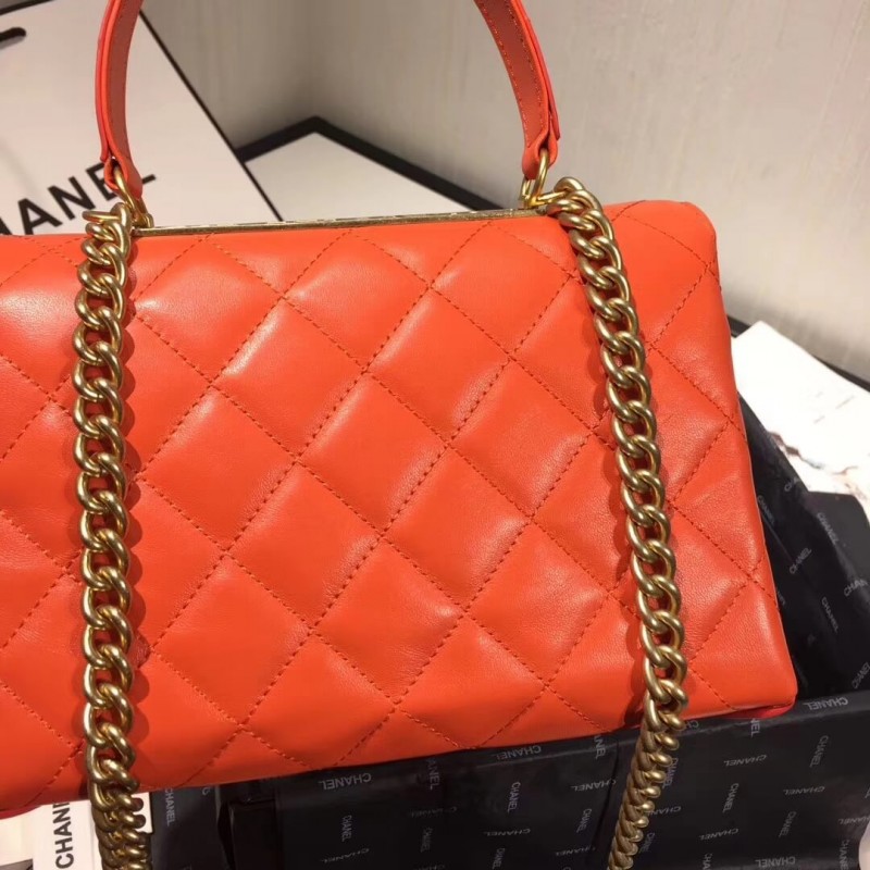 First of all, it’s a top handle bag but comes with a boy-inspired chain. The vintage CC logo is striped in the middle as it features a curved flap. The bag is diamond quilted with 2 compartments in the inside. But what’s really stunning is the vintage metal signature plate that’s built on the top (in the same way as the Trendy CC Bag.