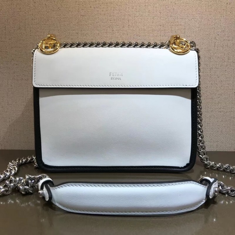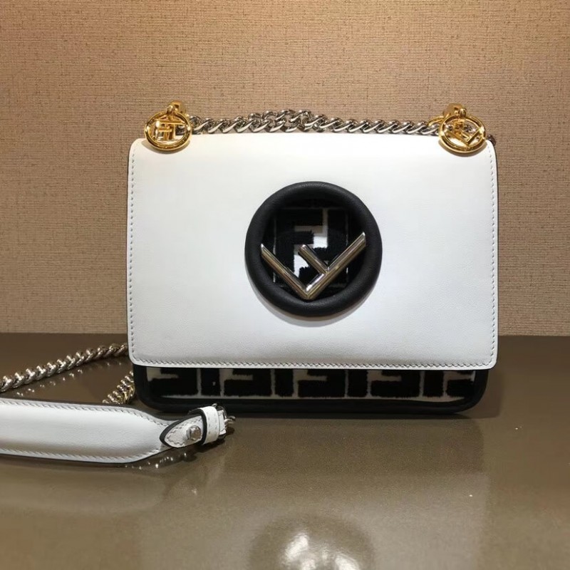 Mini-bag with flap and new Fendi logo. Magnetic closure. Gusseted interior with a pocket. Can be worn cross-body or carried in the hand thanks to the long sliding chain shoulder strap. Made of black leather. A mix of palladium-finish and gold-finish metalware.