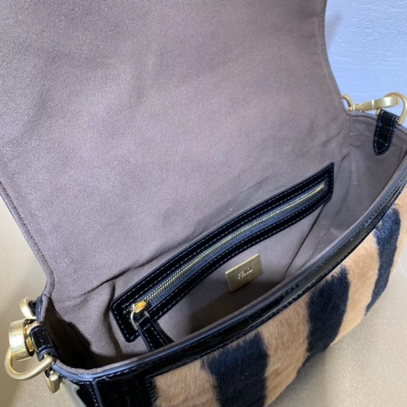 Iconic Baguette bag in medium size, with flap and FF fastening with magnetic clasp. Lining with zip pocket. Can be carried by hand or worn cross-body thanks to the detachable shoulder strap. Made of beige patent leather with inlays in Pequin-striped brown and black sheepskin. Gold-finish metalware.