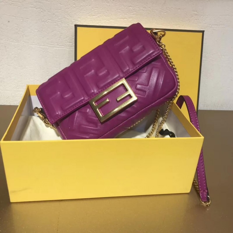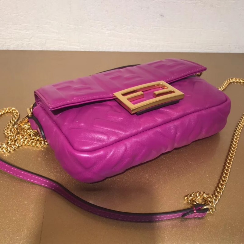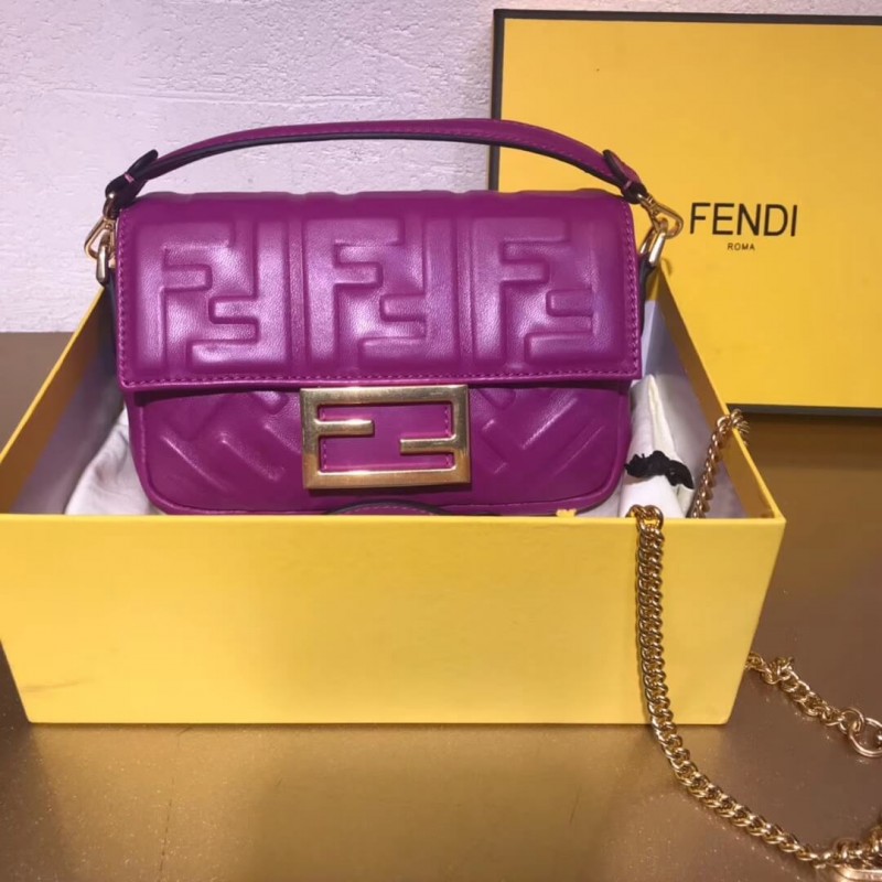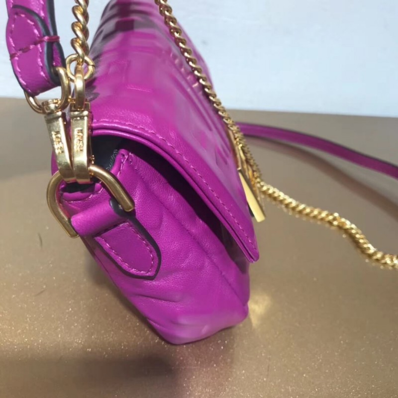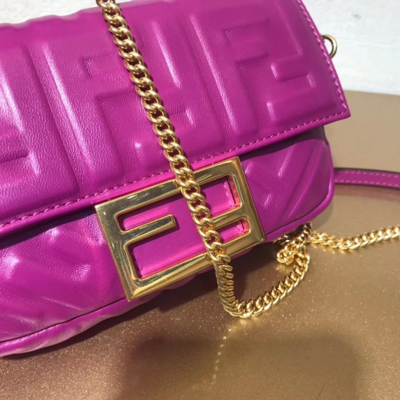 Iconic Baguette bag in mini size, with flap and FF magnetic clasp fastening. Features a long adjustable and detachable chain and leather shoulder strap. Made of black nappa leather with all-over FF motif in a soft, 3D texture. Gold-finish metalware.