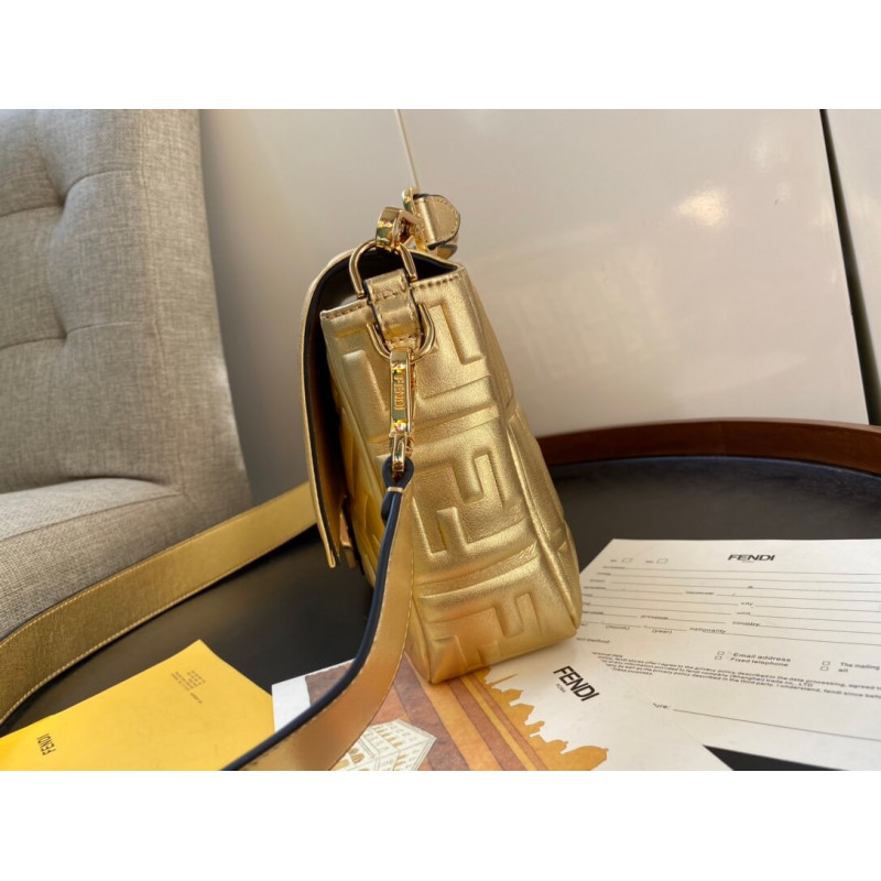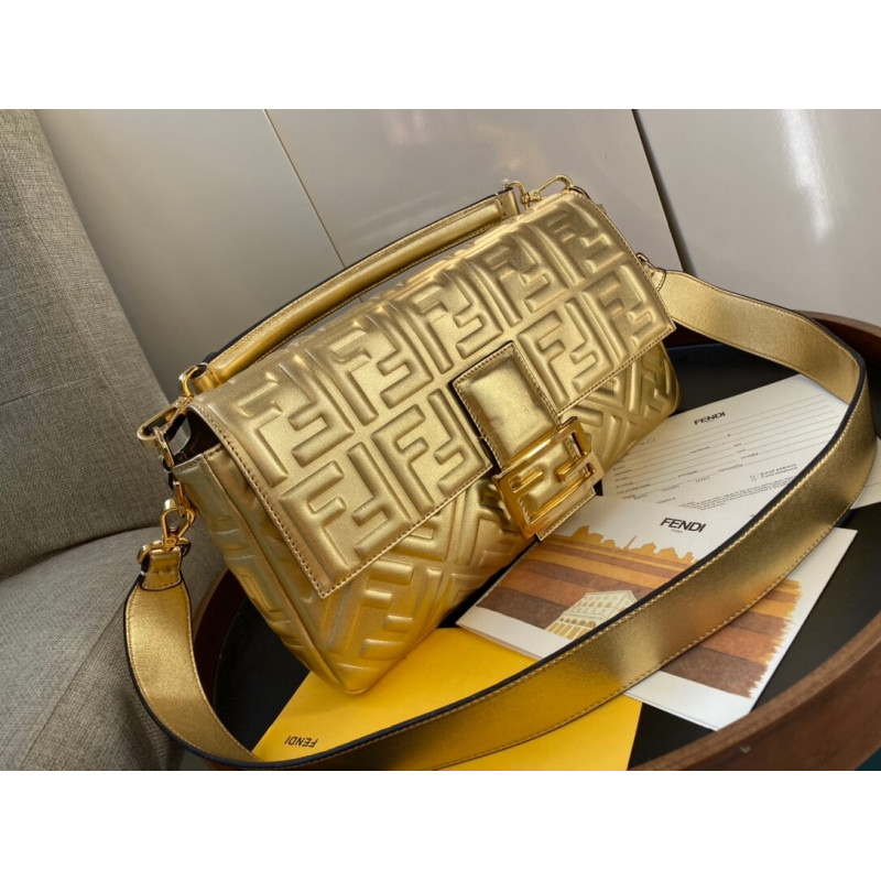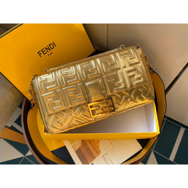 Iconic Baguette bag in medium size, with flap and FF fastening with magnetic clasp. Lining with zip pocket. Can be carried by hand or worn cross-body thanks to the detachable shoulder strap. Made of mirror-effect golden leather. Finished with embossed FF motif. Gold-finish metalware.