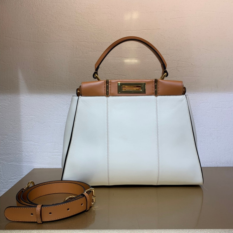 Medium handbag made with 2 compartments divided by a stiff partition. Twist lock on both sides. Lining with zippered pocket. Single handle and an adjustable, detachable shoulder strap. Made of whitecalfskin. Two-tone contrasting details. Gold-finish metalware.