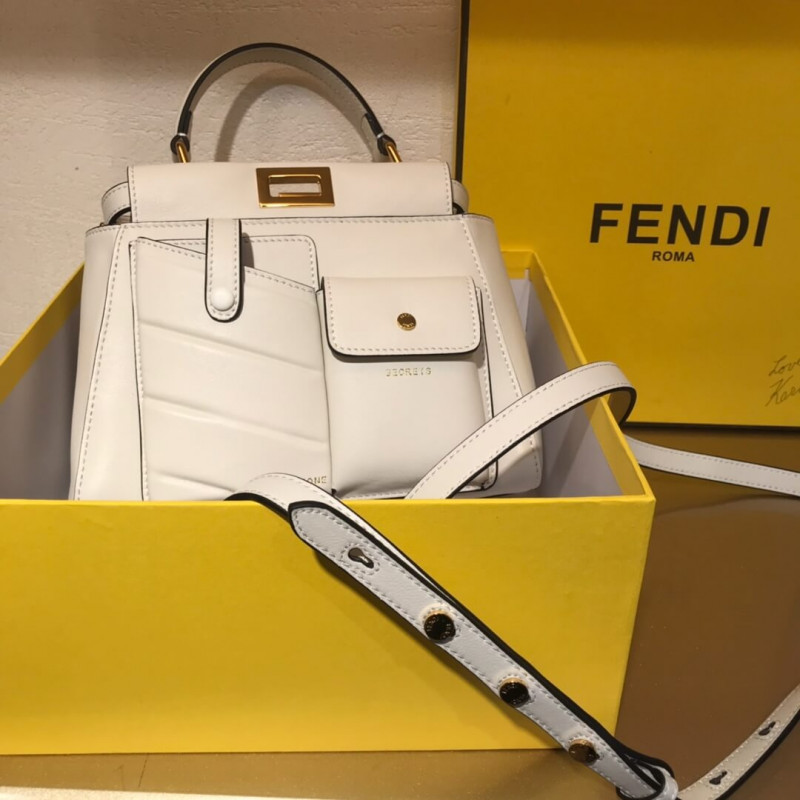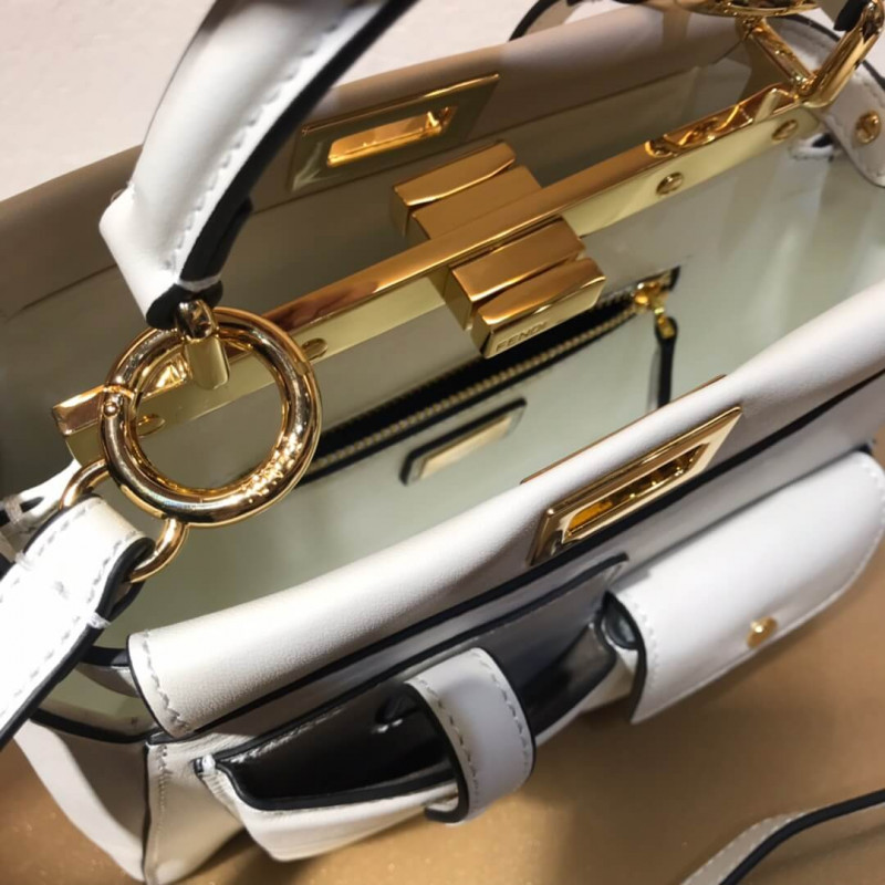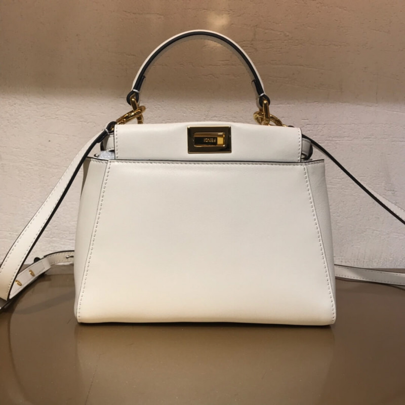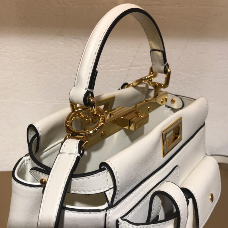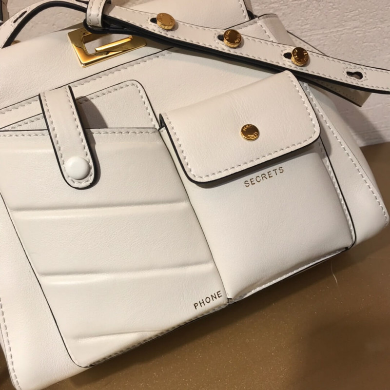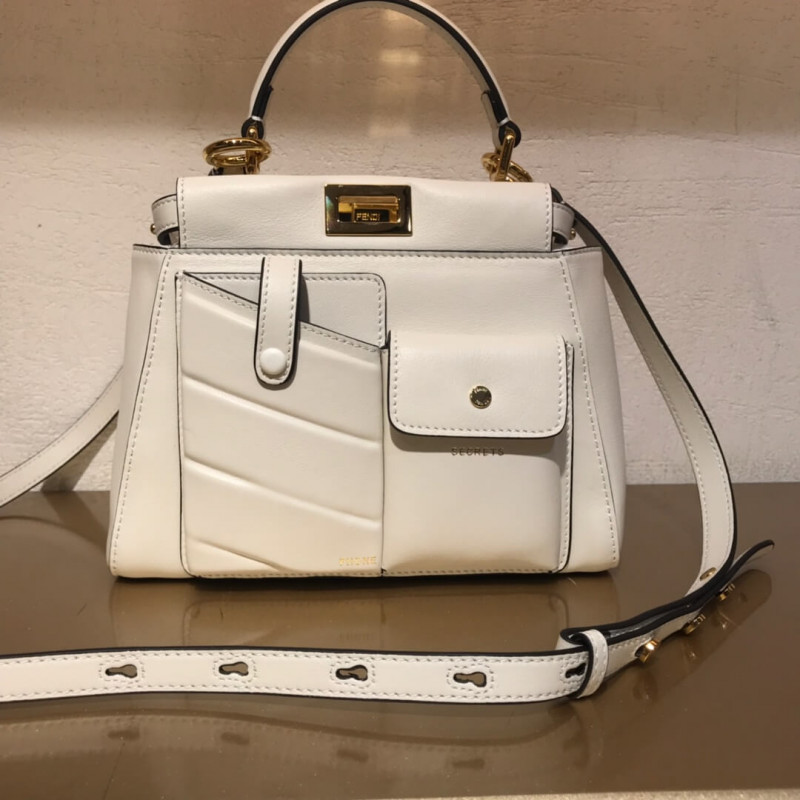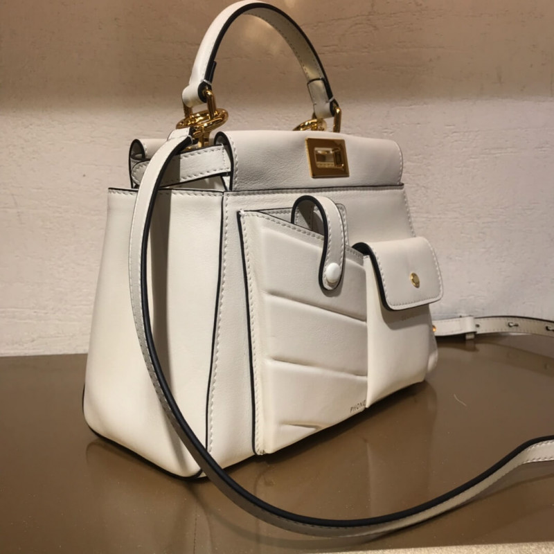 Small handbag made with two compartments divided by a stiff partition. Twist lock on both sides. The bag is decorated with three exterior pockets of different dimensions. Lining with zippered pocket. Single handle and an adjustable, detachable shoulder strap. Made of smooth, rust-brown calf leather. Gold-finish metalware.