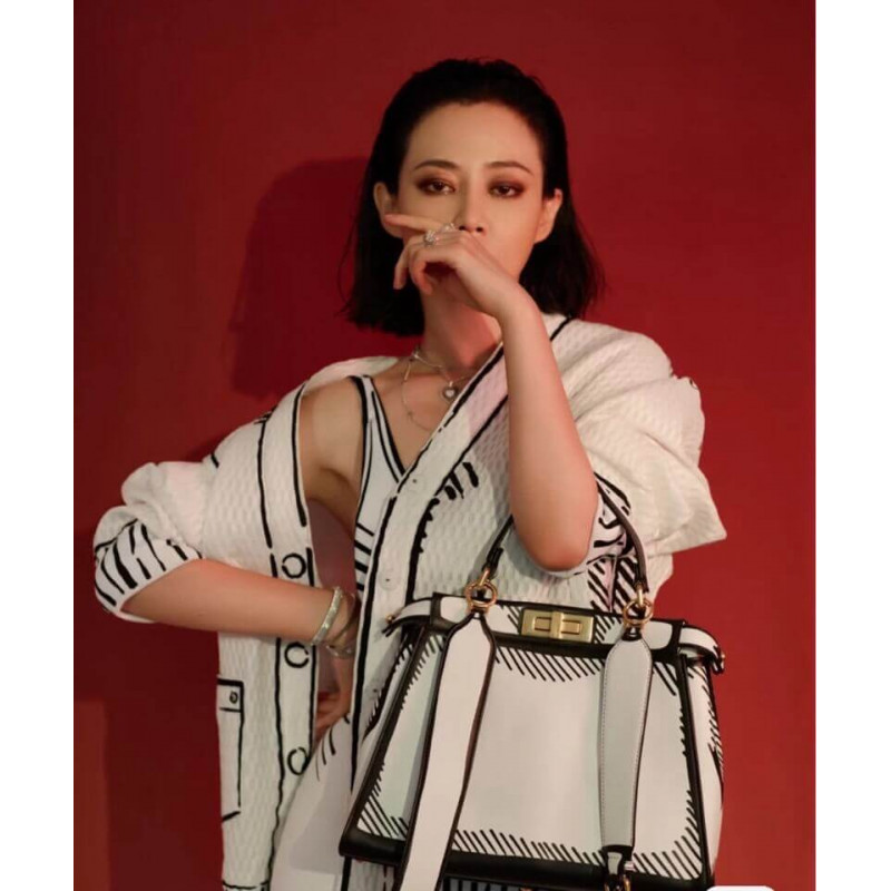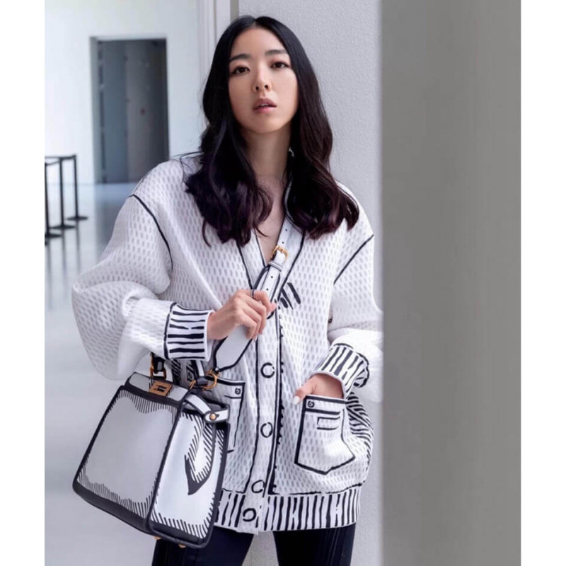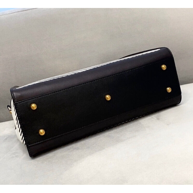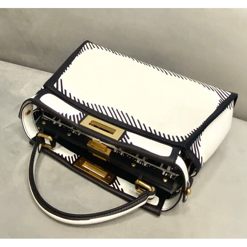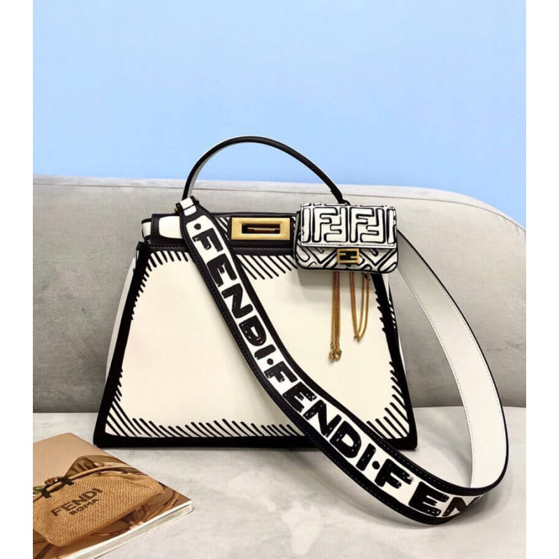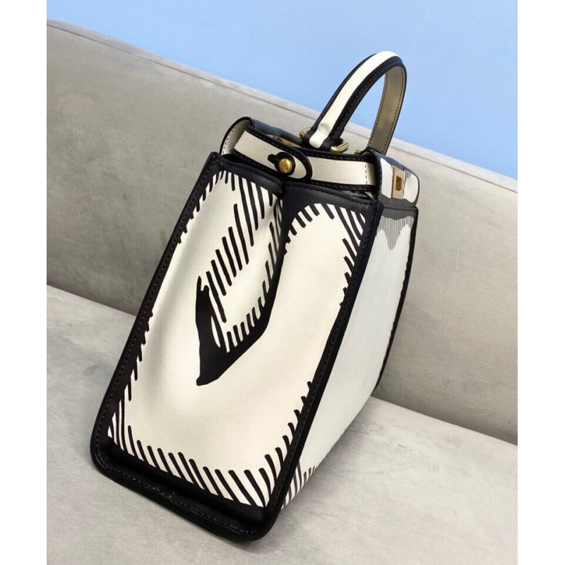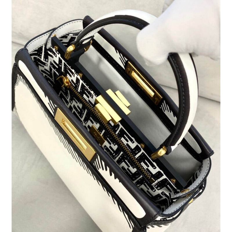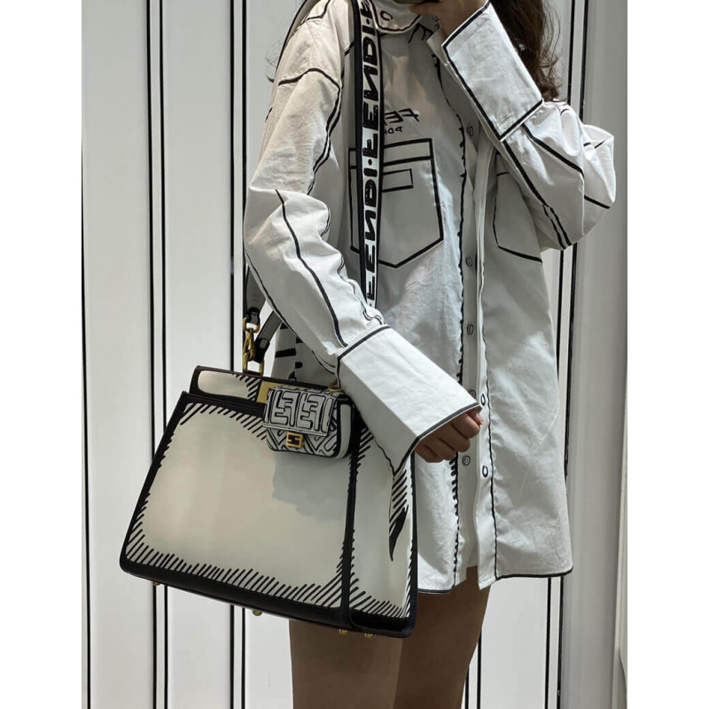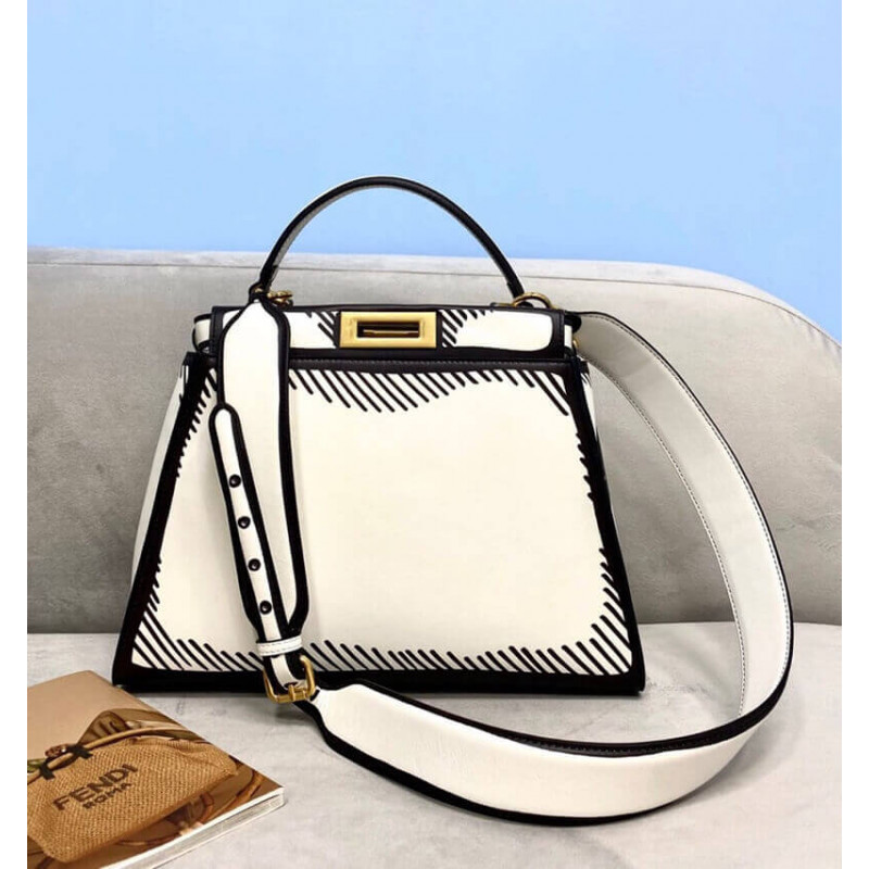Medium iconic Peekaboo bag, made of white leather decorated with edges and details marked by a contrasting black graphic outline that creates a two-dimensional effect, and with the classic twist lock on both sides.