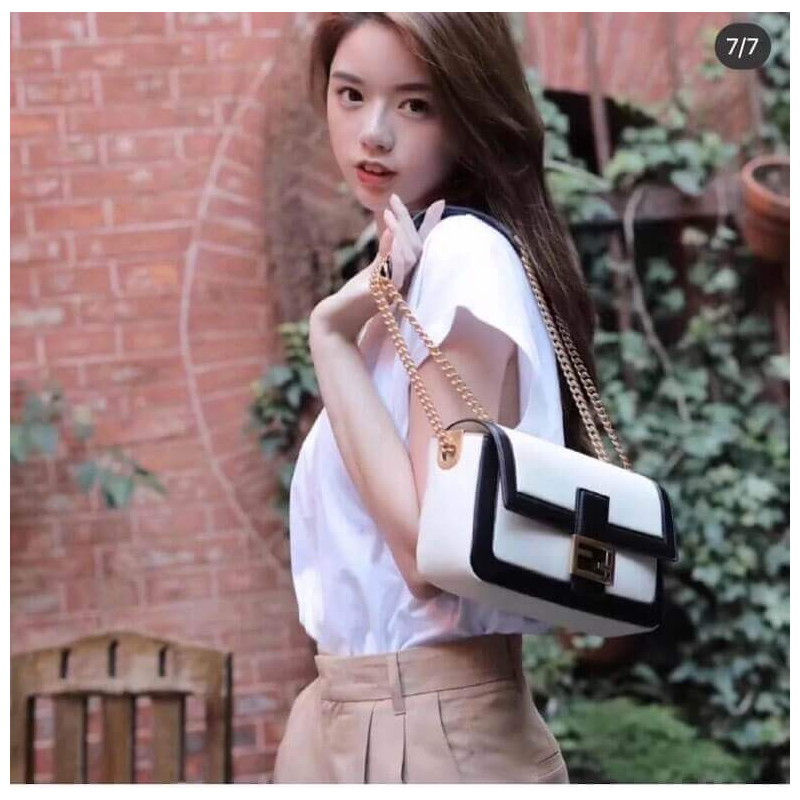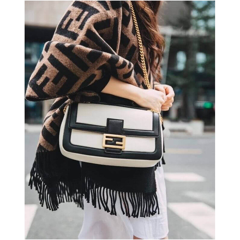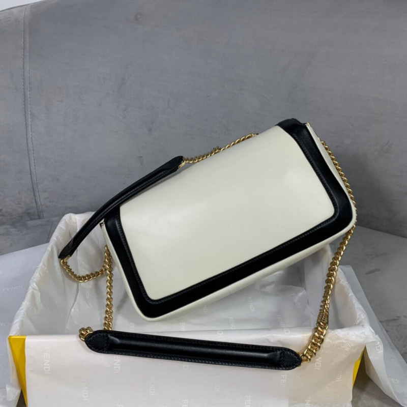 Baguette bag with sliding chain made from soft white nappa leather, finished with black nappa leather trims and details. Decorated with an FF clasp.