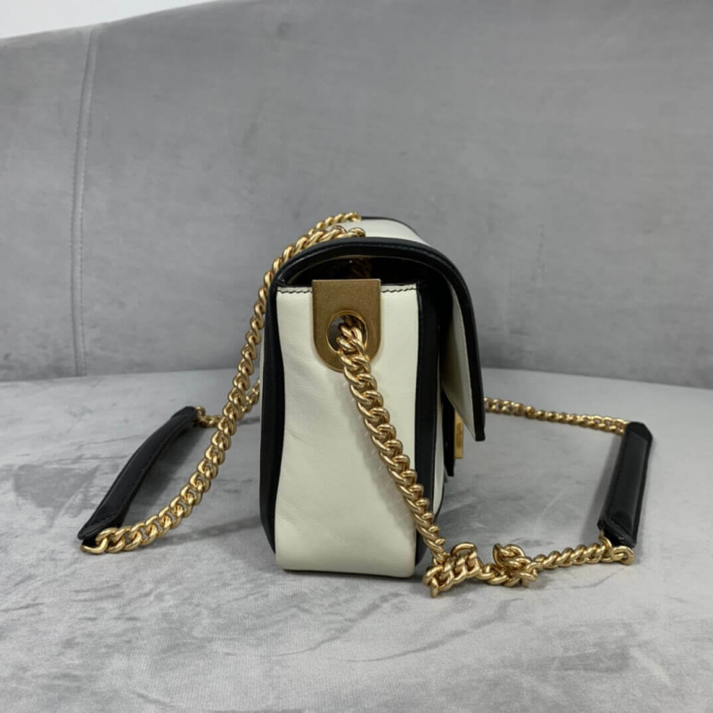 Can be carried by hand or worn over the shoulder or cross-body thanks to the sliding chain shoulder strap with double strap-pad in leather.