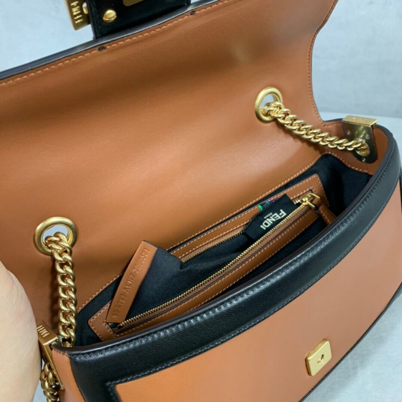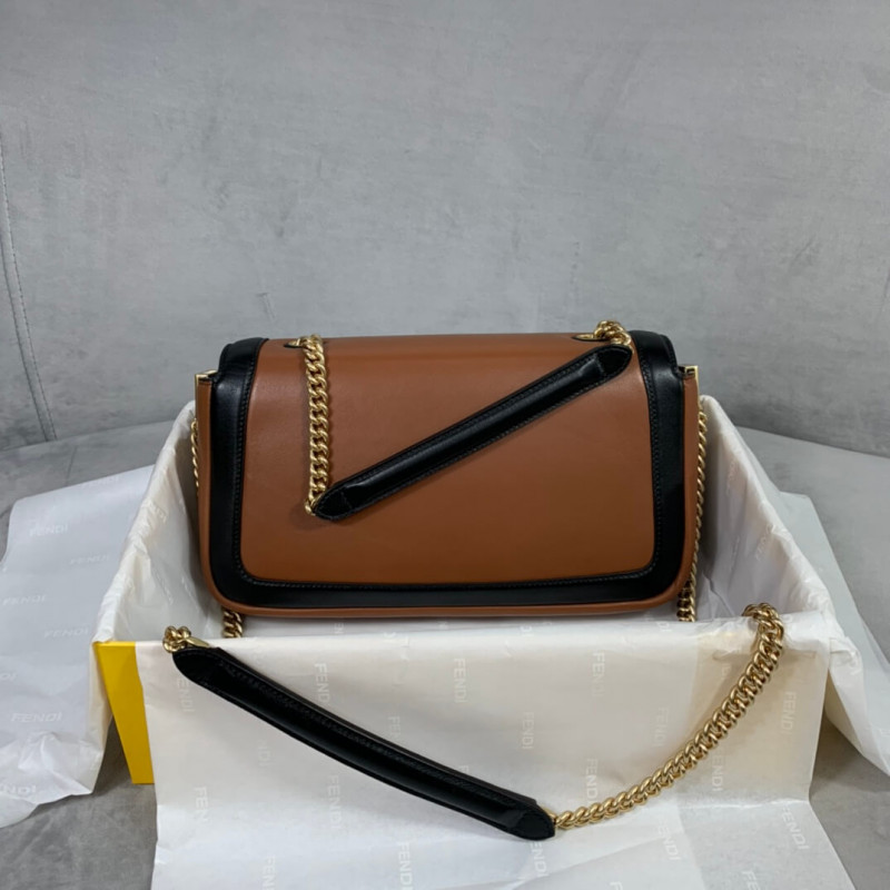 Baguette bag with sliding chain made from soft white nappa leather, finished with black nappa leather trims and details. Decorated with an FF clasp.