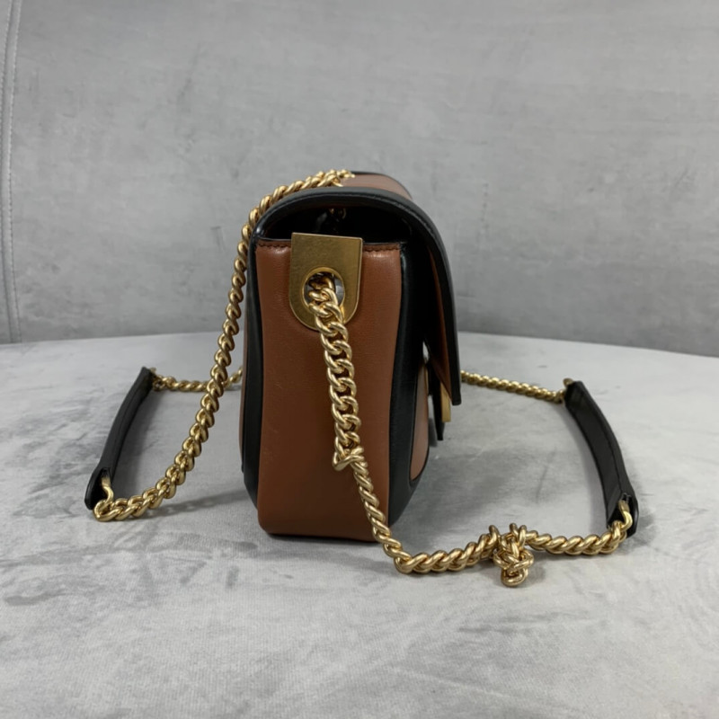 Can be carried by hand or worn over the shoulder or cross-body thanks to the sliding chain shoulder strap with double strap-pad in leather.