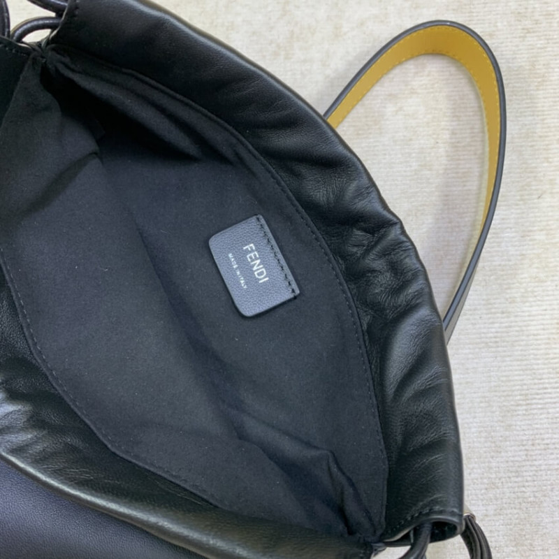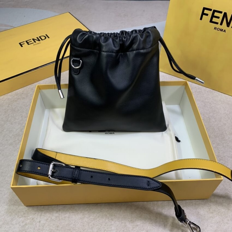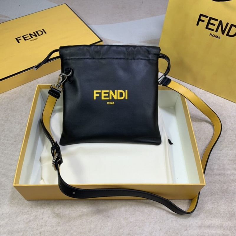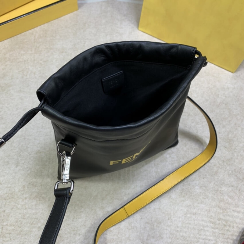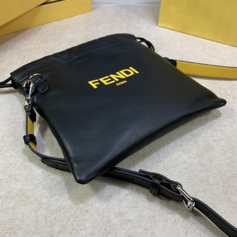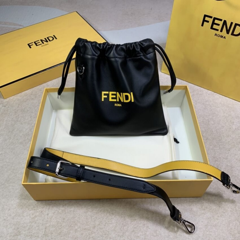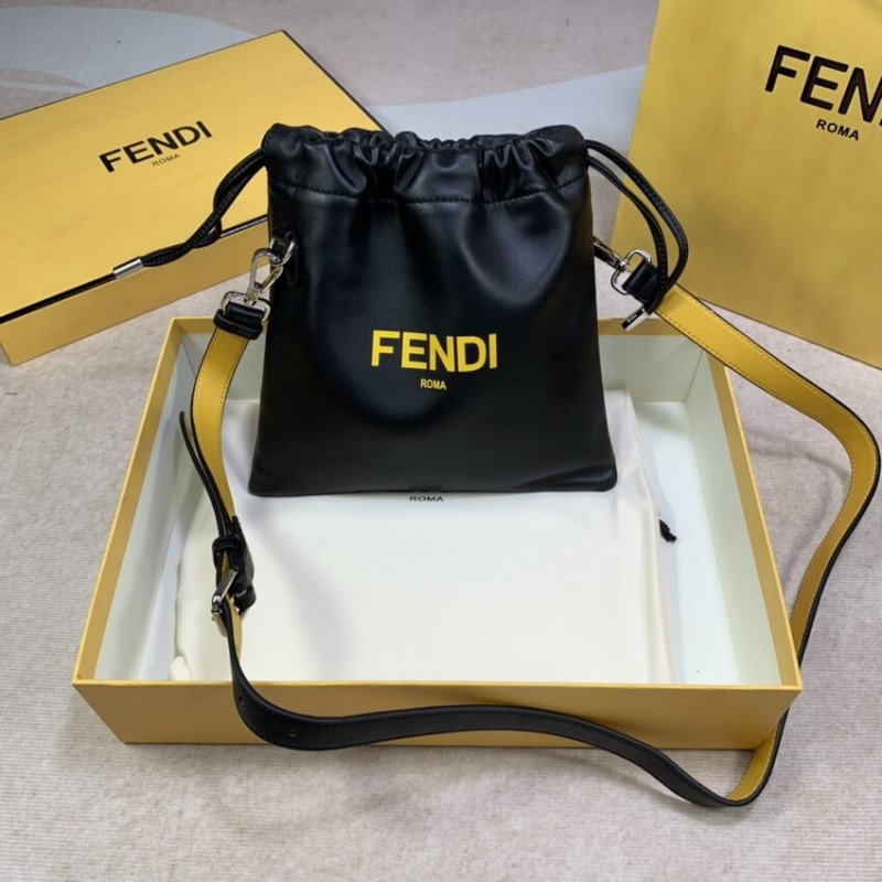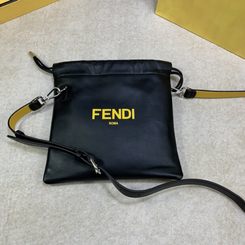 Small pouch bag with drawstring made of pink nappa leather with black “FENDI ROMA”. Featuring a roomy lined interior and gold-finish metalware. It can be carried by hand or worn either on the shoulder or cross-body thanks to the comfortable, adjustable and detachable shoulder strap.