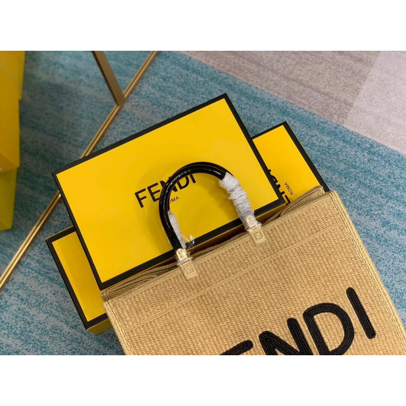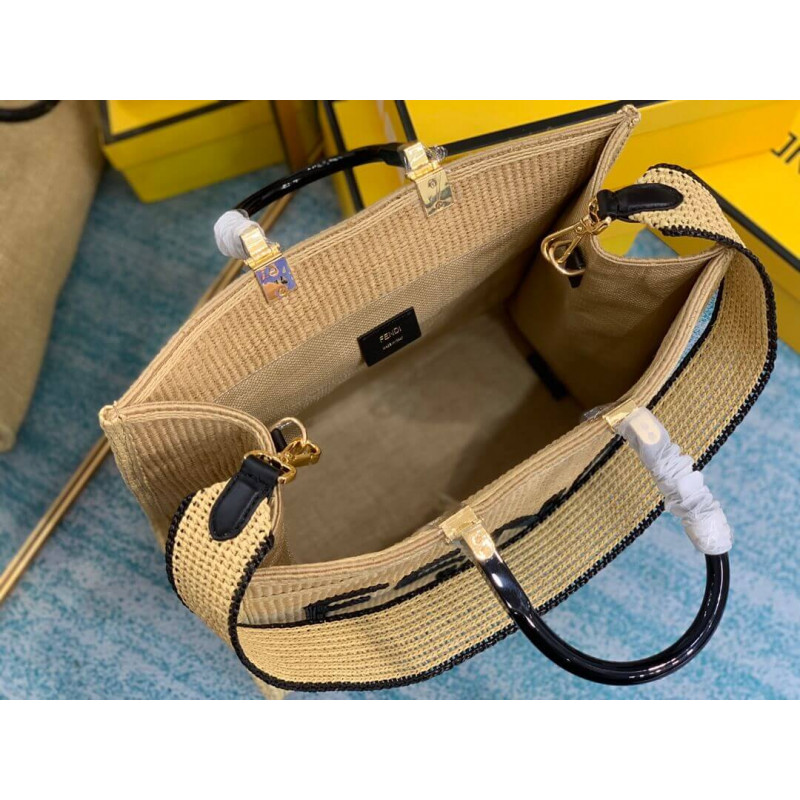 Fendi s Sunshine Shopper tote is spacious enough for all the daily essentials, from your laptop to a spare pair of pumps. Crafted from raffia in the label s Italian atelier, it s woven with a statement logo in contrasting black. Even the acrylic handles are detailed with gold FF branding.