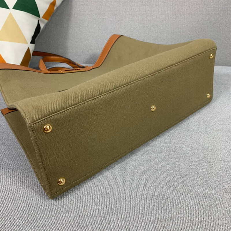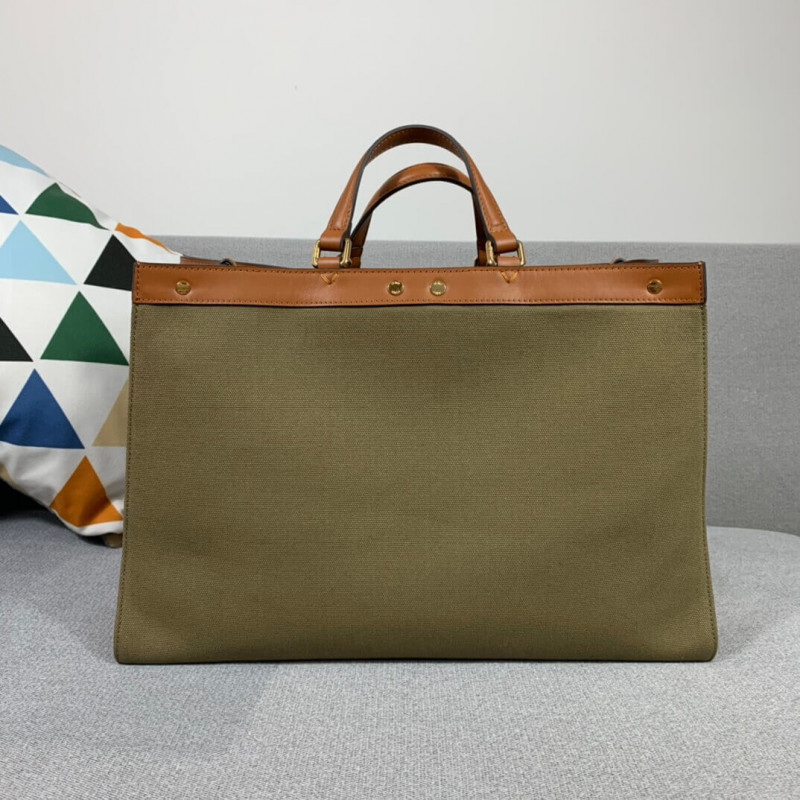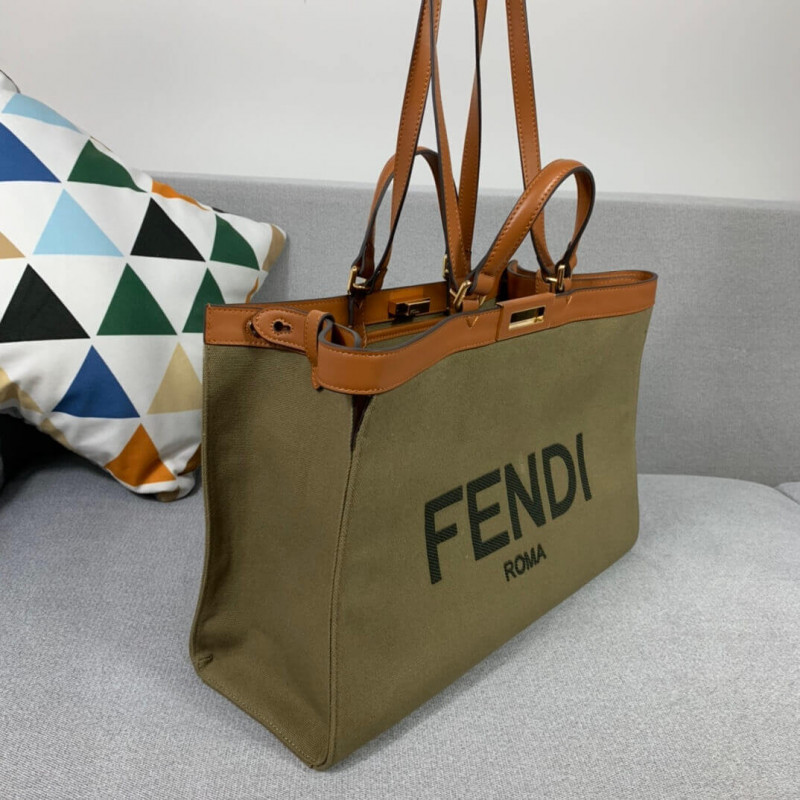 Large Peekaboo X-Tote with internal leather pocket and iconic twist lock. With two short handles for carrying by hand and two long handles for wearing over the shoulder. Made of dark green canvas. Decorated with FENDI ROMA motif in tone-on-tone embroidery. Contrasting brown leather trim. Gold-finish metalware.