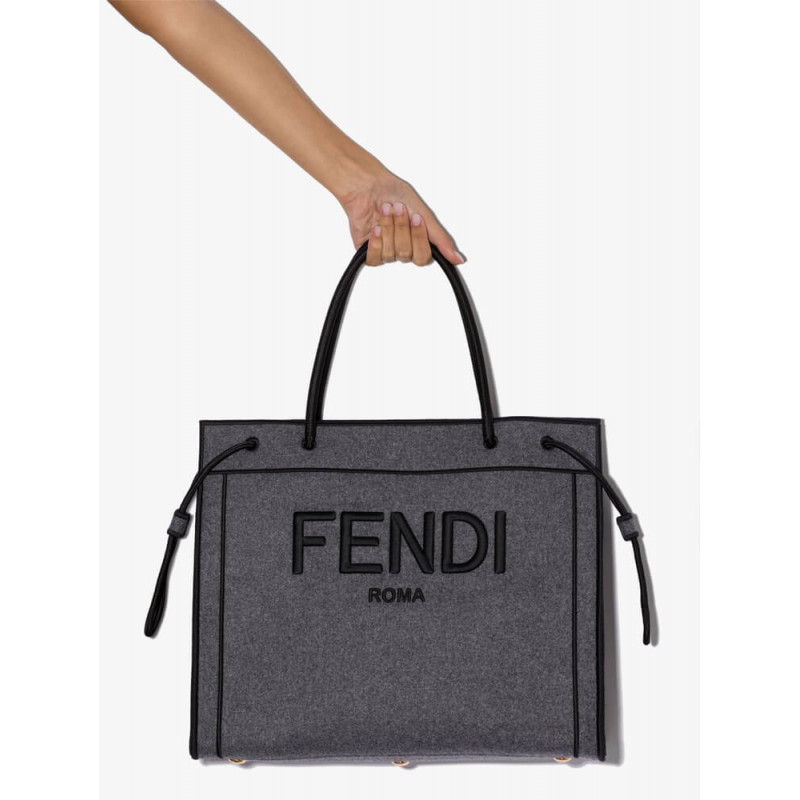 This grey Fendi Roma small tote bag is crafted in Italy with mélange felted flannel and accented with black trims. Featuring an embroidered logo across the front, this style has top handles and drawcord sides. Naples and Florence are beautiful, but have you seen this Fendi Roma bag? Now that s magnifico.