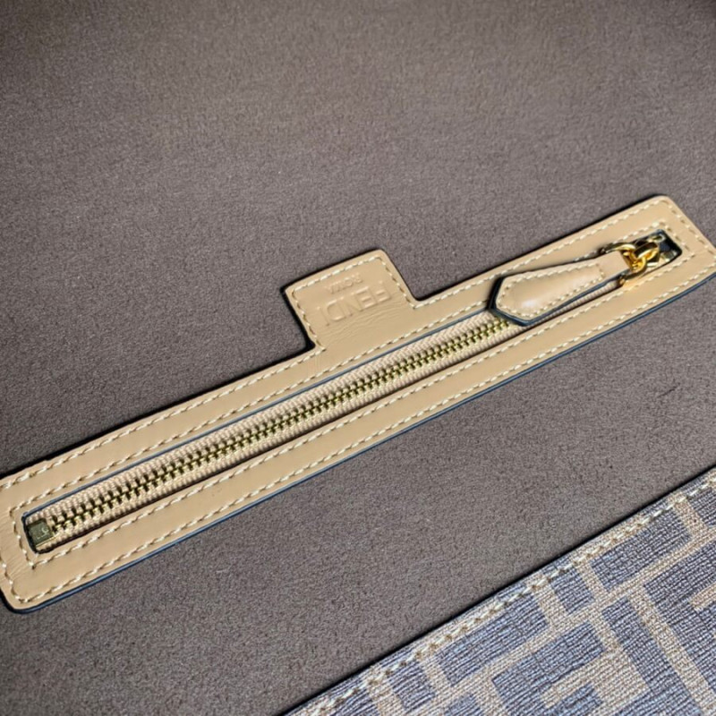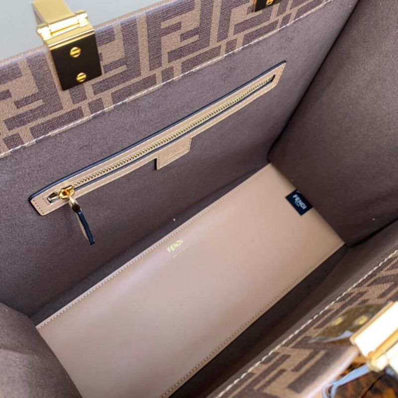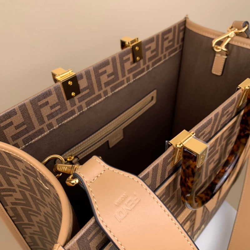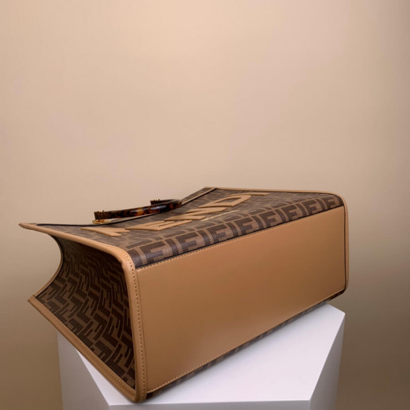 Medium Sunshine Shopper bag in glazed fabric with multicolor leather FF printed and hand inlaid motif. Embellished with embossed FENDI lettering. Tortoiseshell-effect plexiglass rigid handles