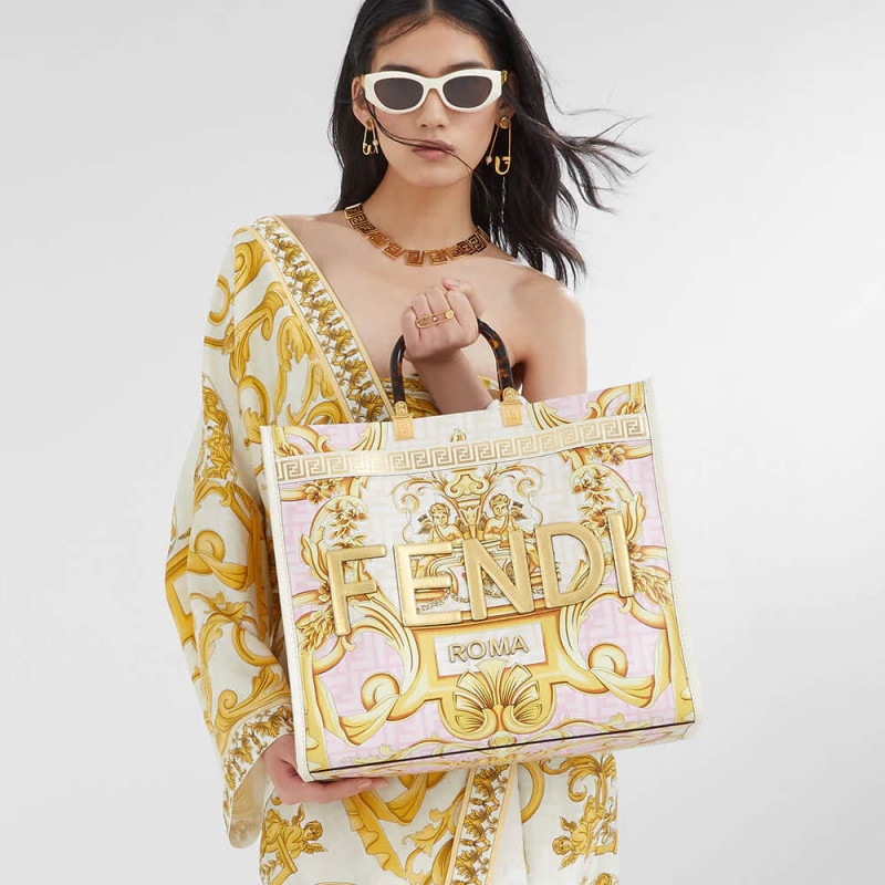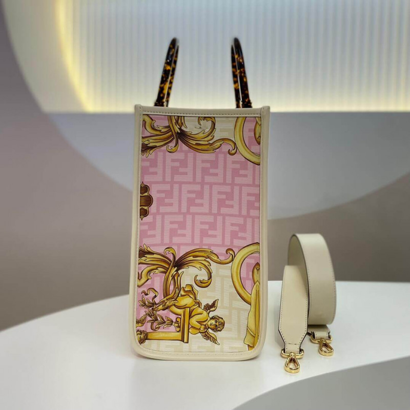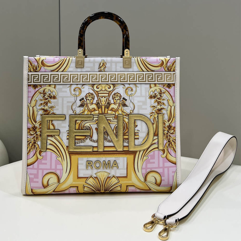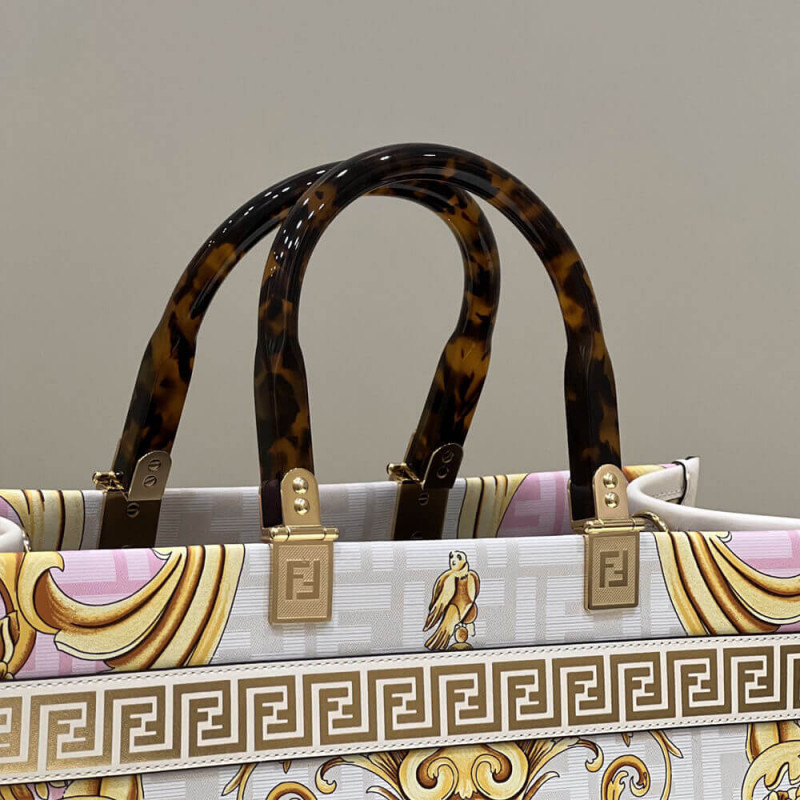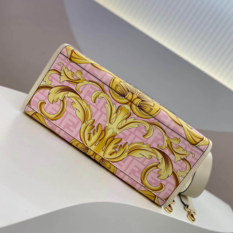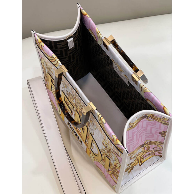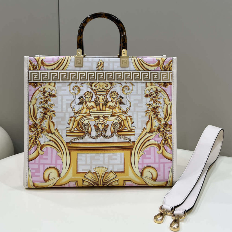 Medium Sunshine shopper made of leather with a Versace by Fendi print. Born of the creative collaboration between the two fashion houses, the graphics combine the iconic Fendi FF logo with the Versace Baroque print in pink, gold and white. Gold laminated leather "FENDI ROMA" lettering and stiff tortoiseshell-effect plexiglass handles.