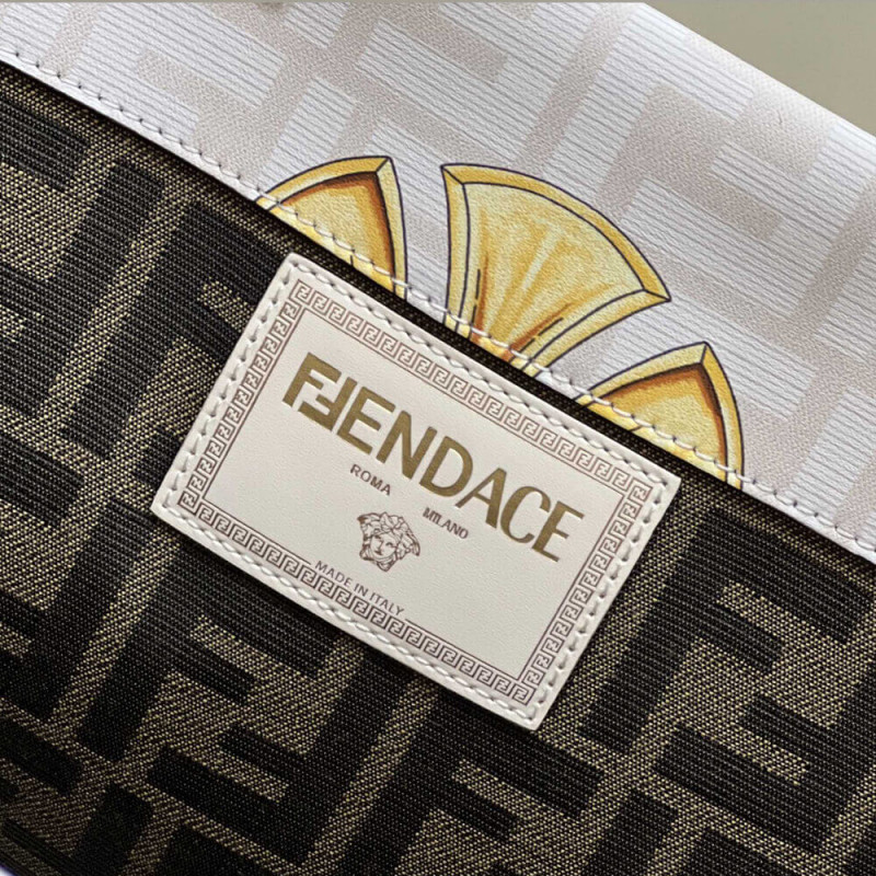 Features a spacious internal compartment lined in FF fabric, white leather edging and gold-finish metalware.