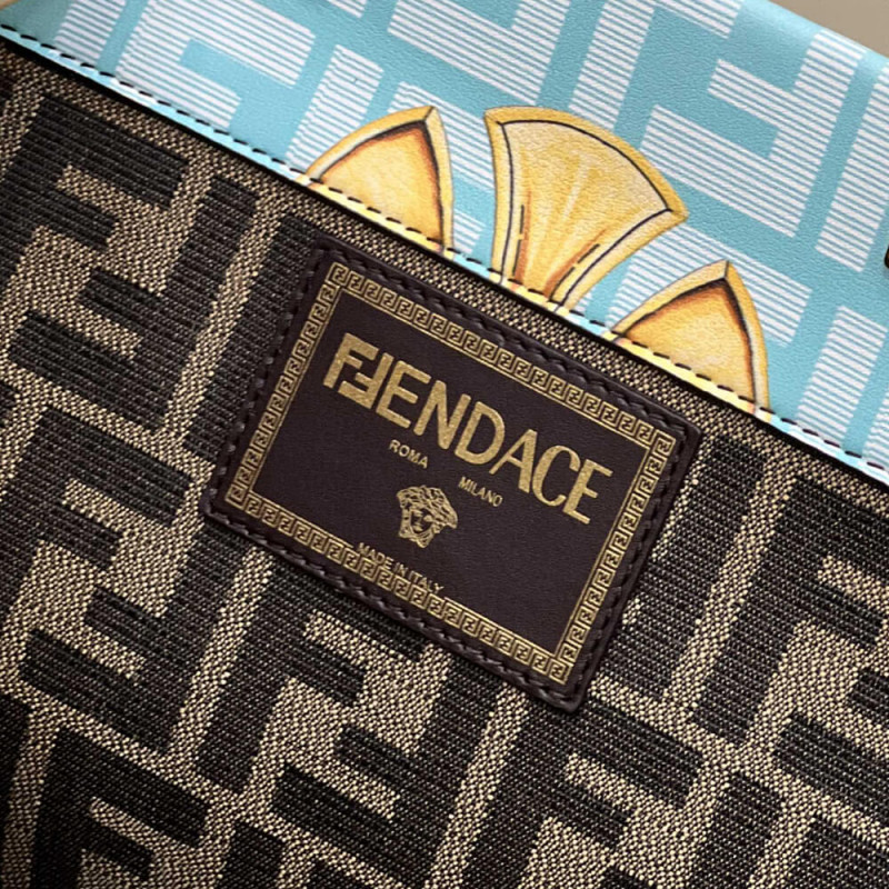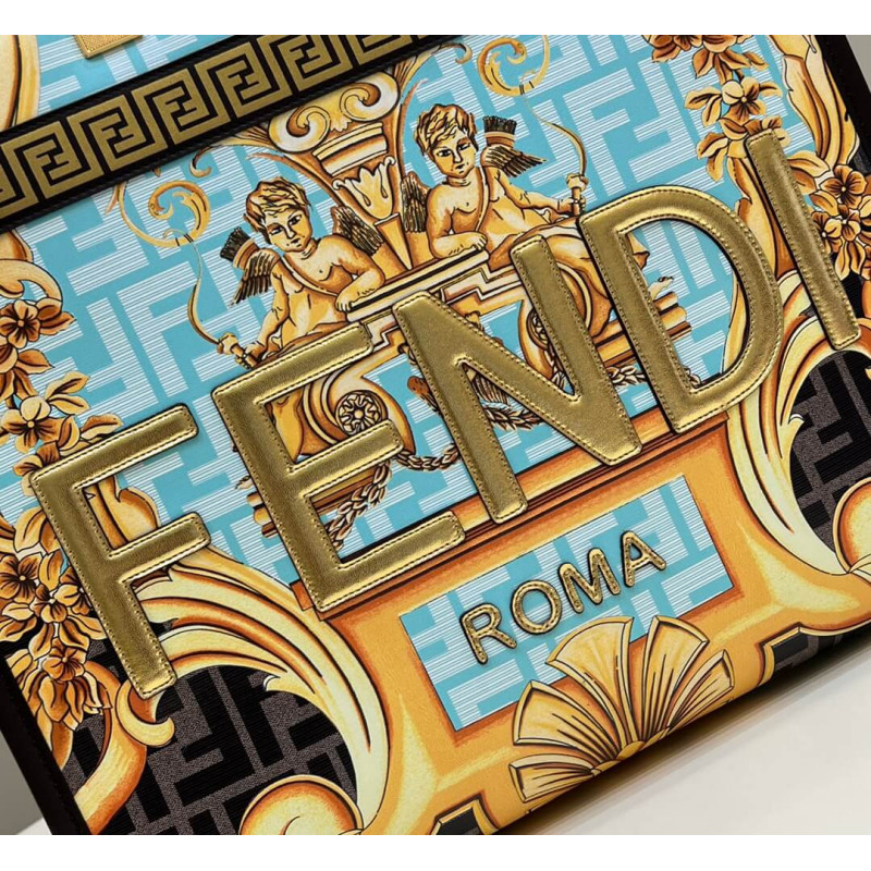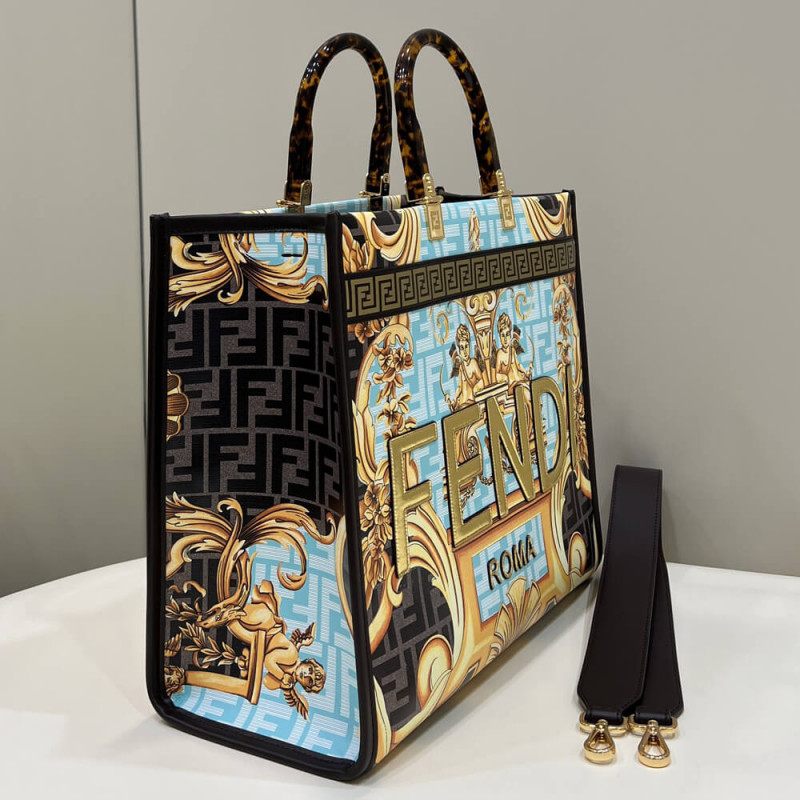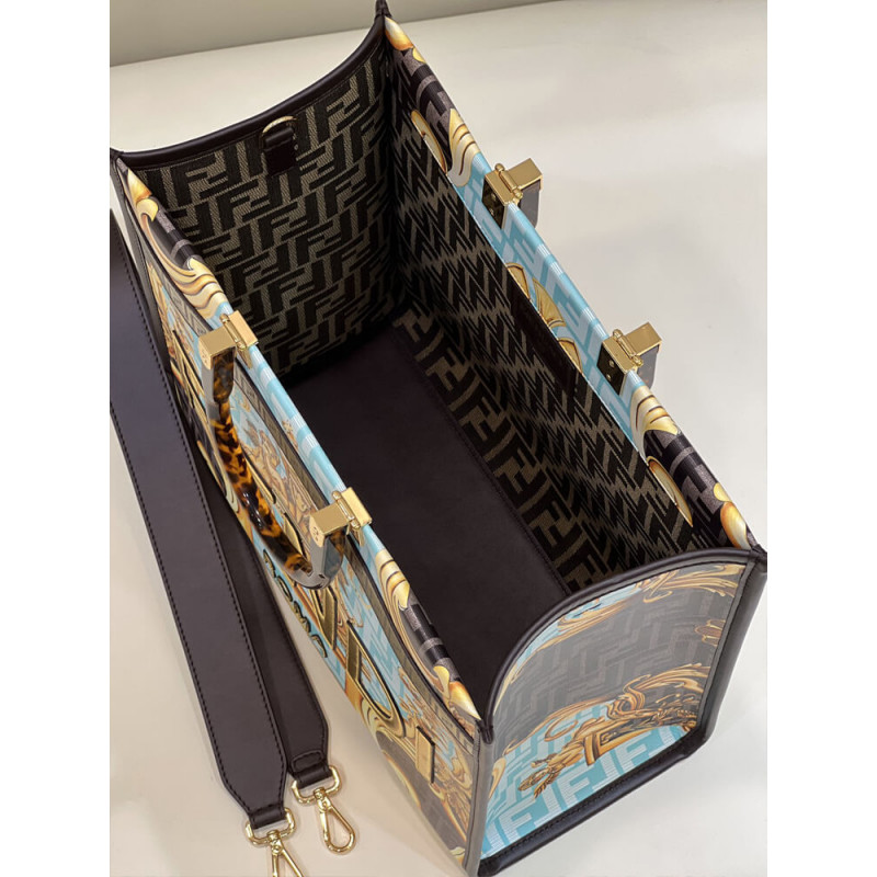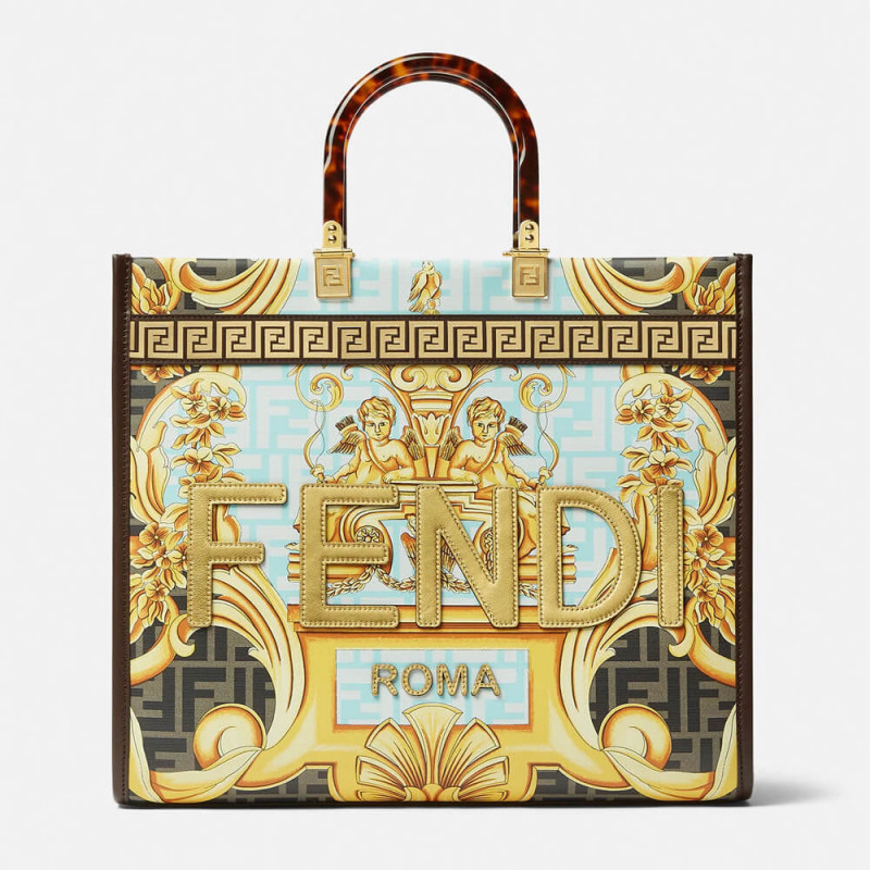 Seen through the eyes of Donatella Versace, Fendi s Sunshine leather tote bag is reimagined with Very Versace elements in the latest Fendi by Versace capsule collection. In the Fendace Gold Baroque print, it features signature hinged tortoiseshell handles and a foiled Fendi Roma logo at the front. The spacious shopper is complete with a Fendace boarder, a FF monogramed lining and a detachable shoulder strap.