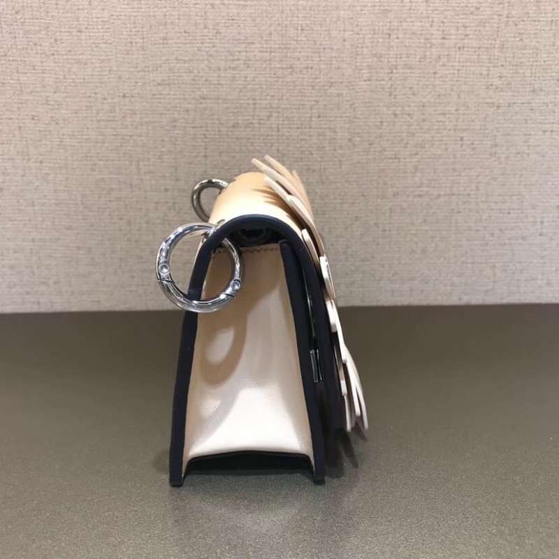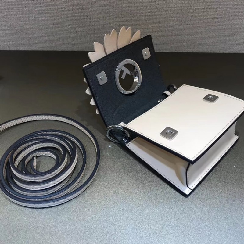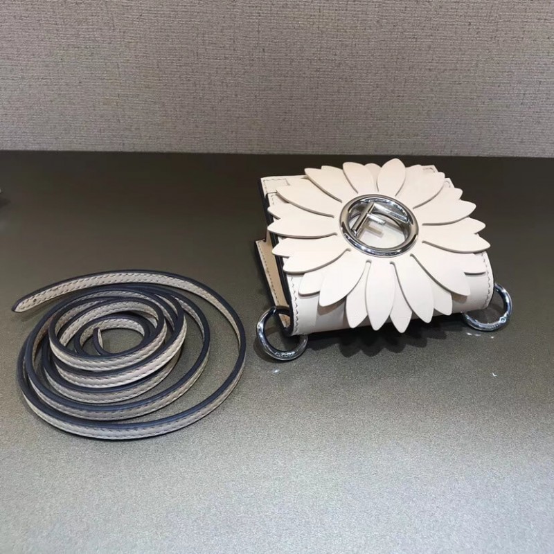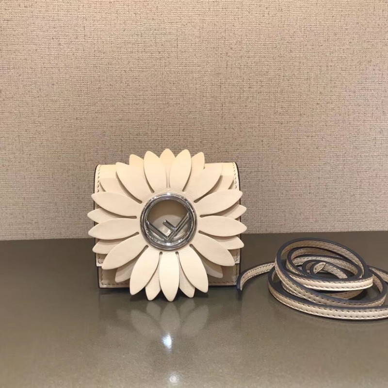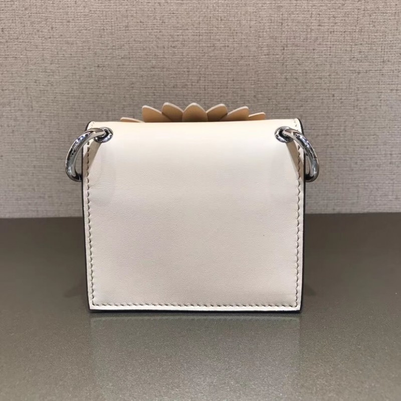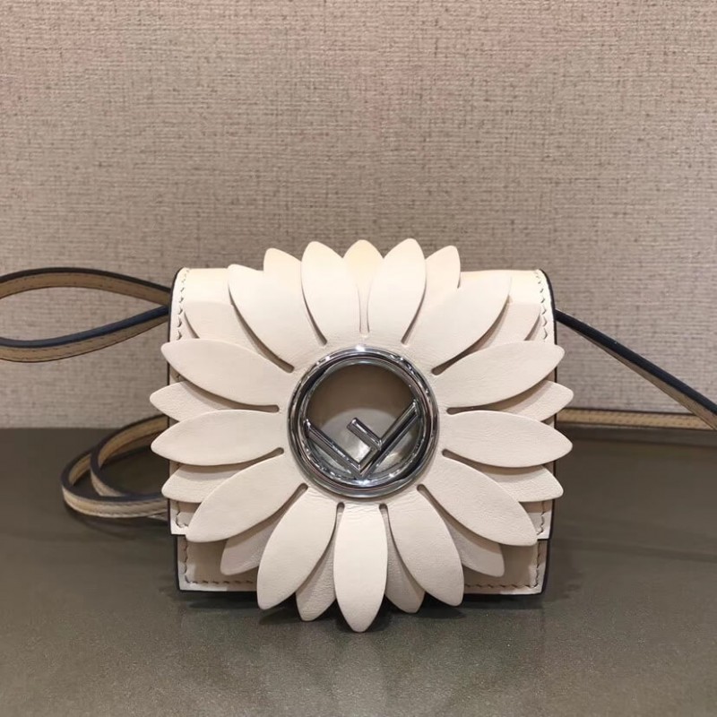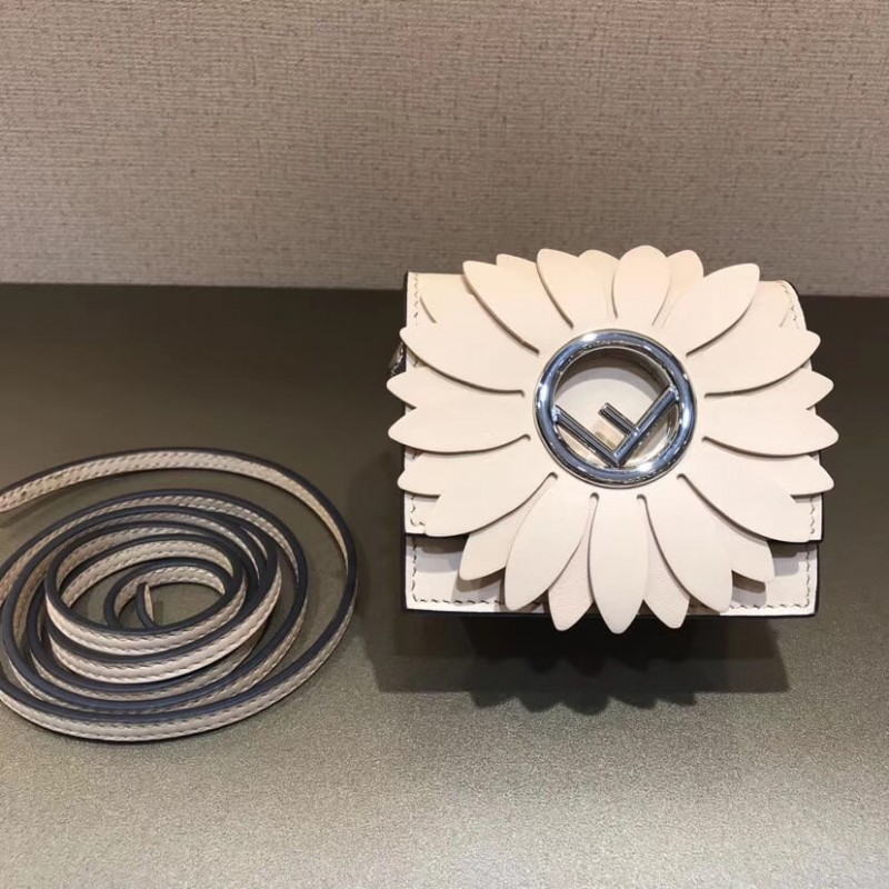 Flip-top mini handbag with the latest FENDI logo. A spring clip on the side that snaps the miniature handbag to the larger handbag. Removable cross-back straps. Made of red leather. The clamshell is decorated with a daisy of the same color, and the center is decorated with a hollowed out sign. Palladium-finished metal hardware.