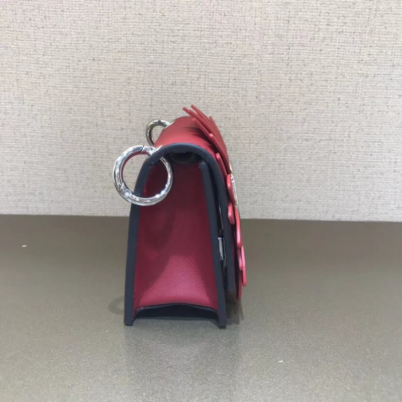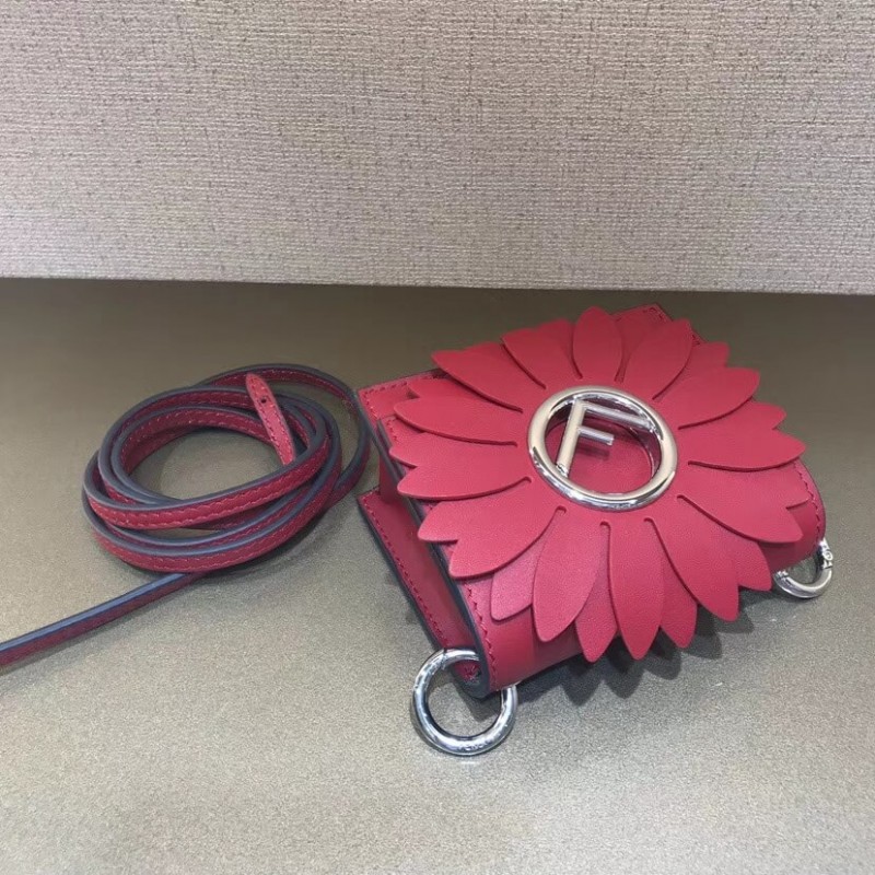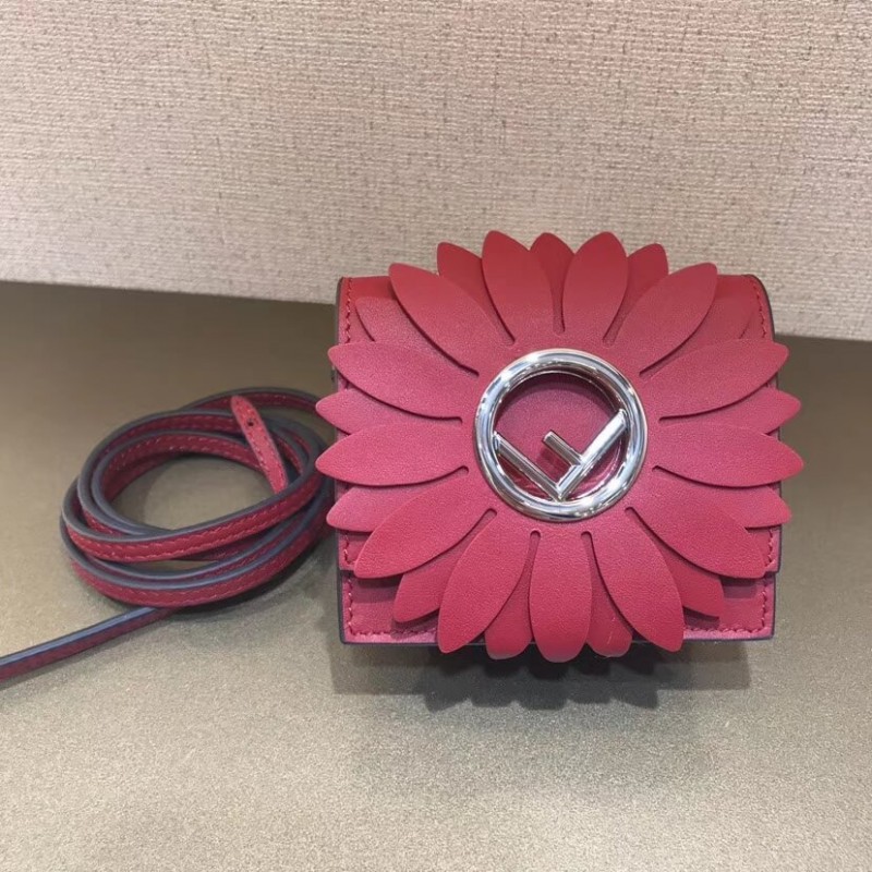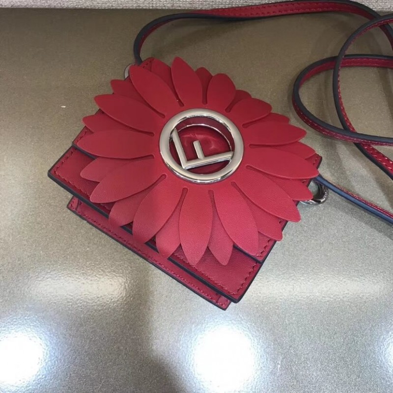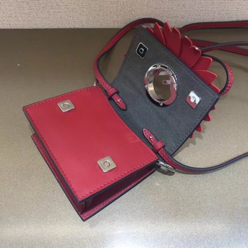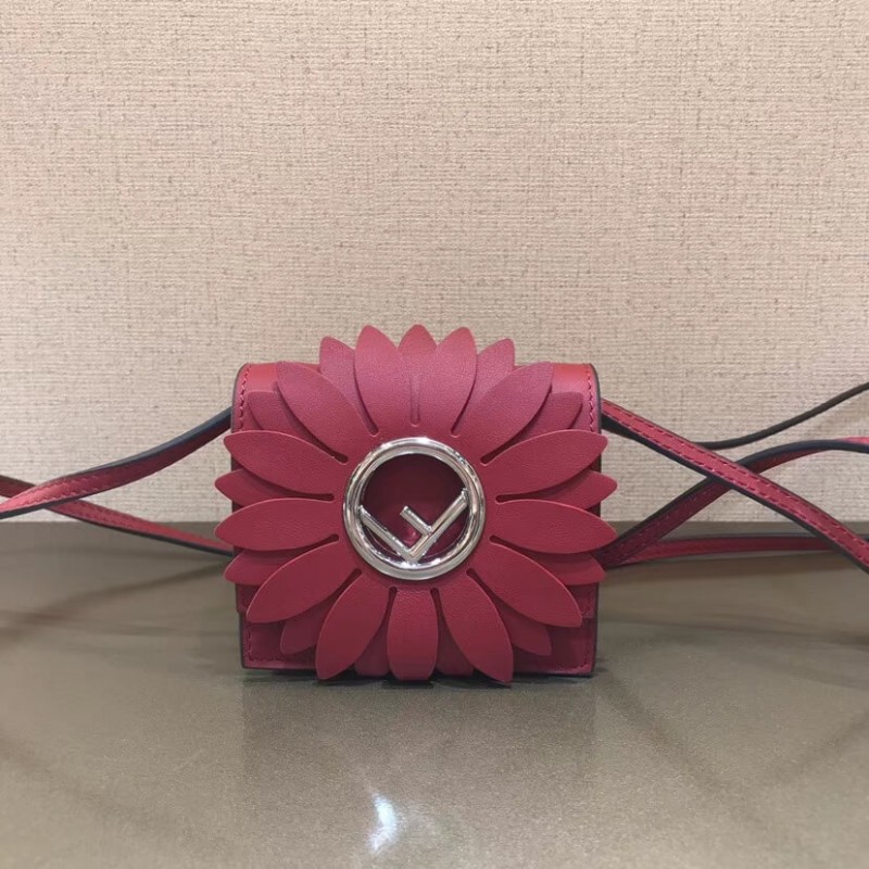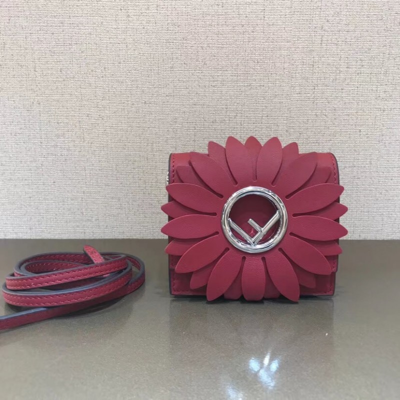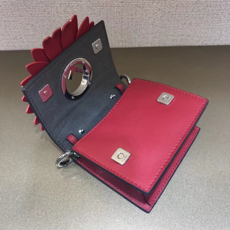 Flip-top mini handbag with the latest FENDI logo. A spring clip on the side that snaps the miniature handbag to the larger handbag. Removable cross-back straps. Made of red leather. The clamshell is decorated with a daisy of the same color, and the center is decorated with a hollowed out sign. Palladium-finished metal hardware.
