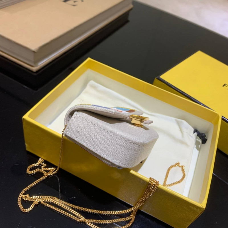 Iconic Baguette bag in Nano version, with flap and FF fastening with magnetic clasp. The clip allows it to be attached to larger bags or belts. It can also be worn cross-body thanks to the thin chain shoulder strap. Lining with flat pocket. Made of beige canvas. Finished with FF motif embroidered in multicolor thread. Gold-finish metalware.