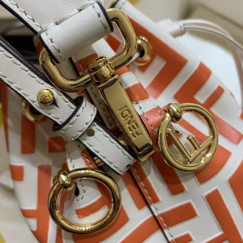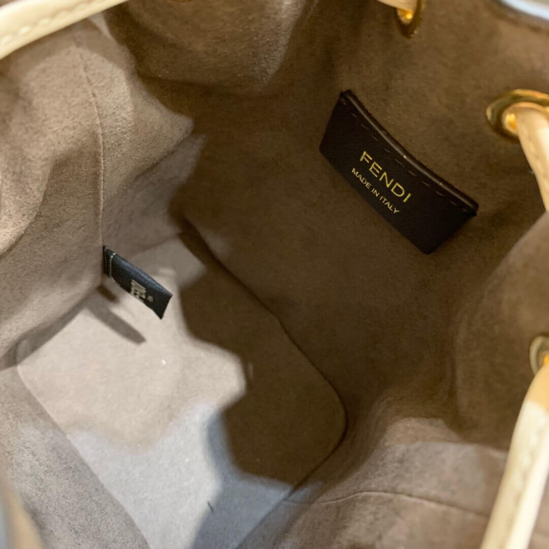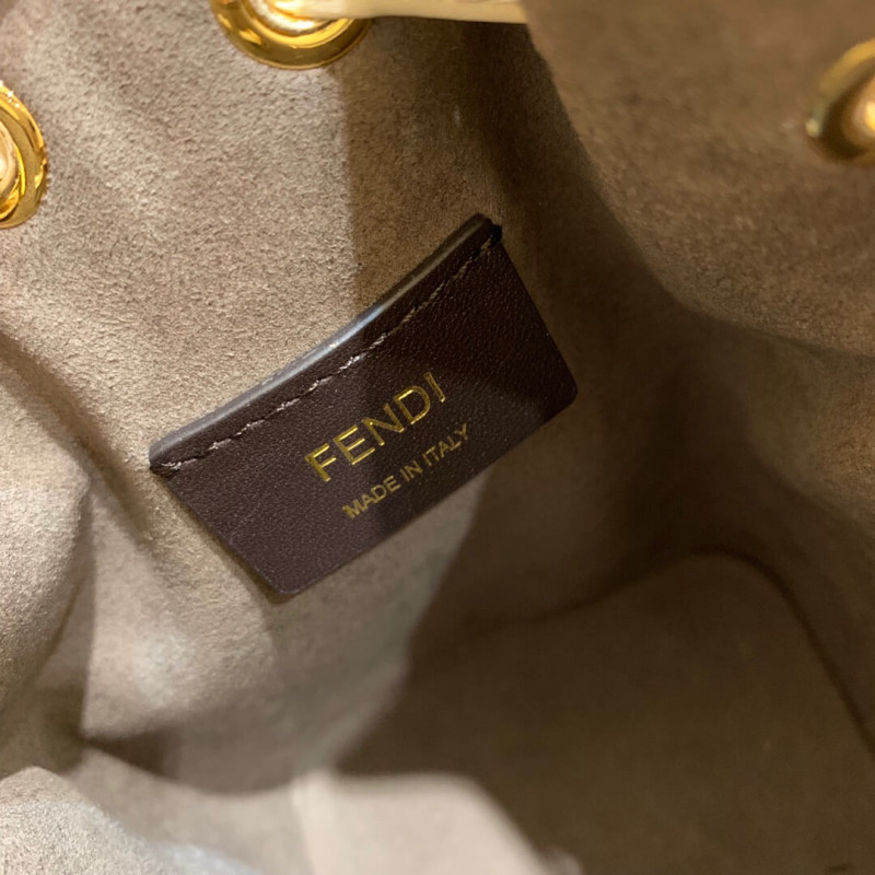 Small Mon Tresor bucket bag with drawstring fastening and metal decorations in the Fendi logo shape. Two detachable shoulder straps, one long and one short, to carry the bag in the hand, over the shoulder or cross-body. Made of brown calfskin. Iconic FF pattern printed in relief and hand-painted in black. Gold-finish metalware.
