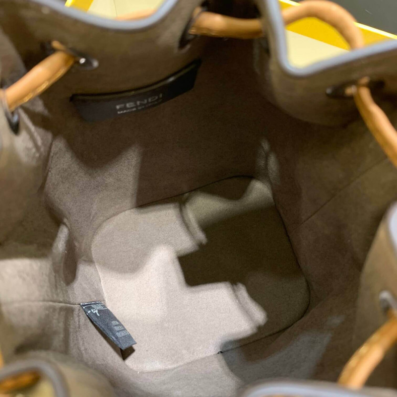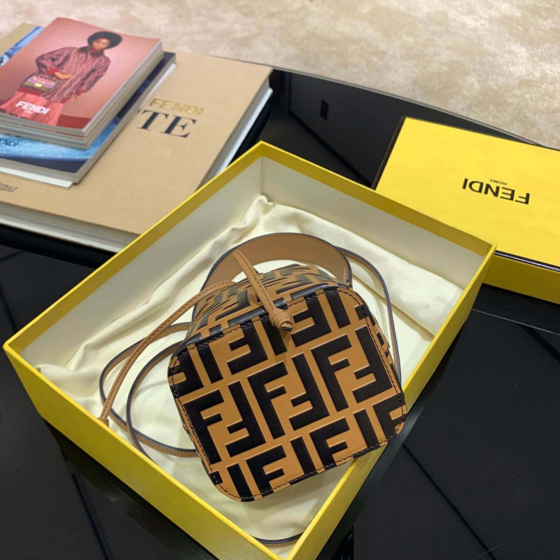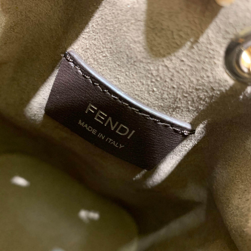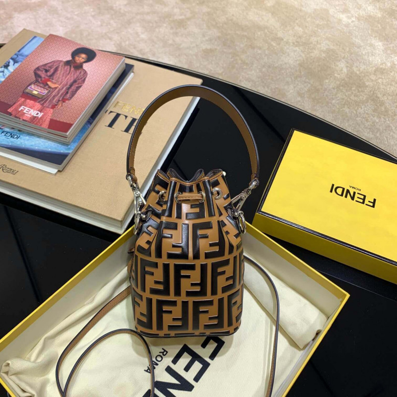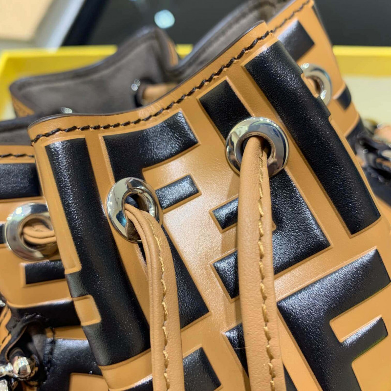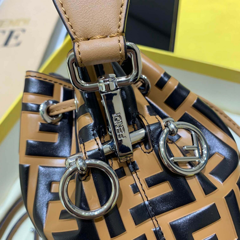 Small Mon Tresor bucket bag with drawstring fastening and metal decorations in the Fendi logo shape. Two detachable shoulder straps, one long and one short, to carry the bag in the hand, over the shoulder or cross-body. Made of brown calfskin. Iconic FF pattern printed in relief and hand-painted in black. Gold-finish metalware.