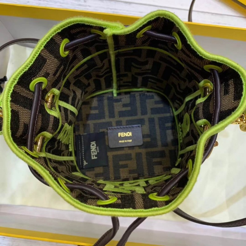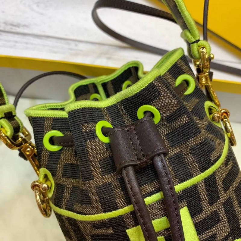 Small Mon Tresor bucket bag with drawstring fastening and metal decorations in the Fendi logo shape. Two detachable shoulder straps, one long and one short, to wear the bag over the shoulder or cross-body. Made of jacquard fabric with macro FF motif. Decorated with Fendi Label motif and edges in neon yellow satin-stitch embroidery. Gold-finish metalware.