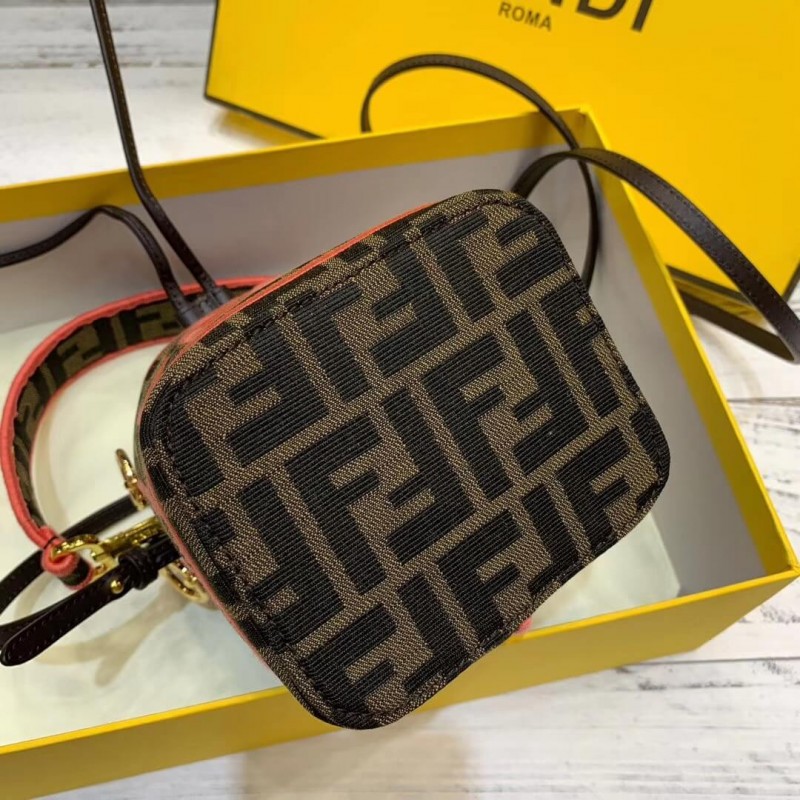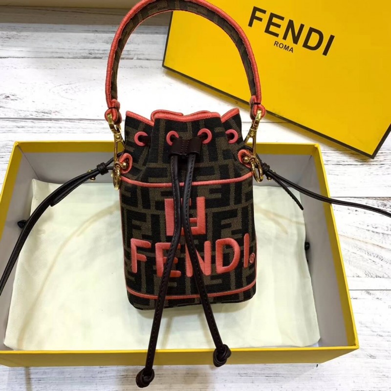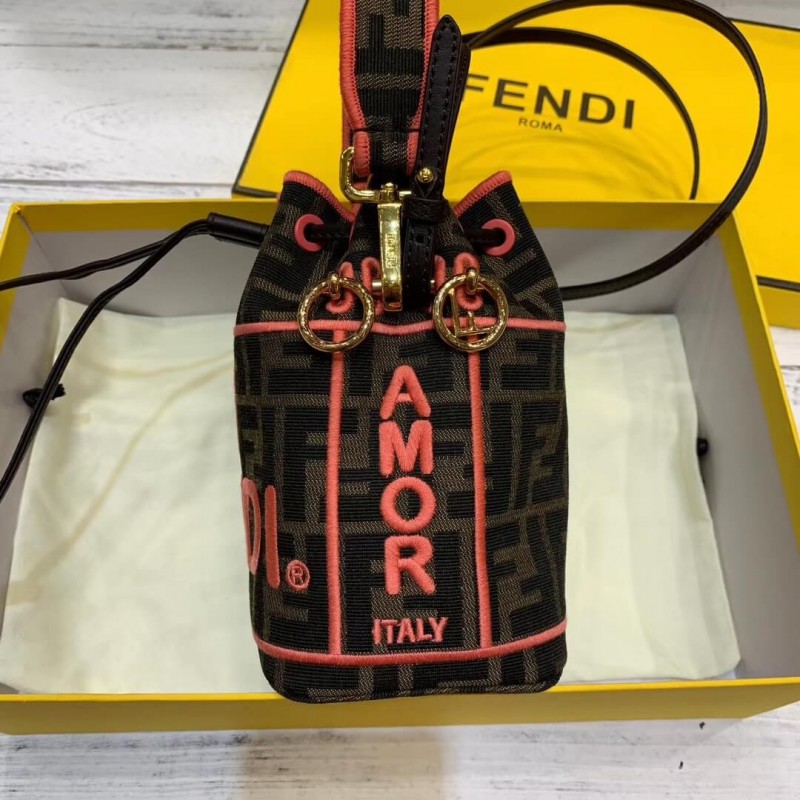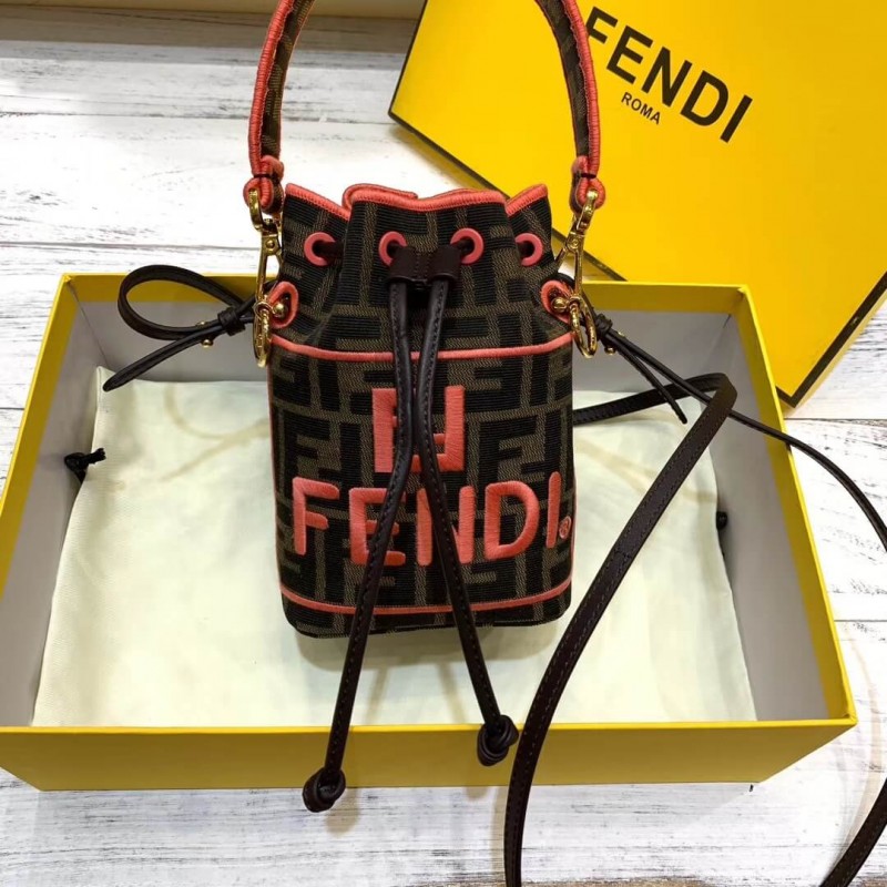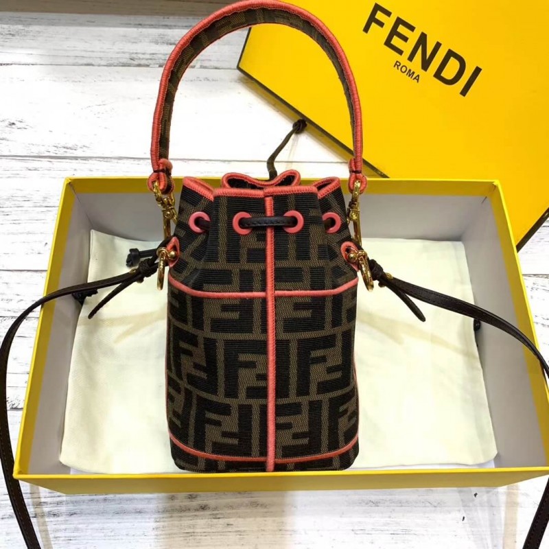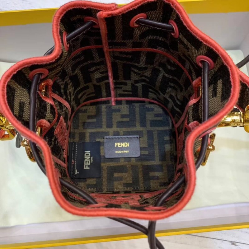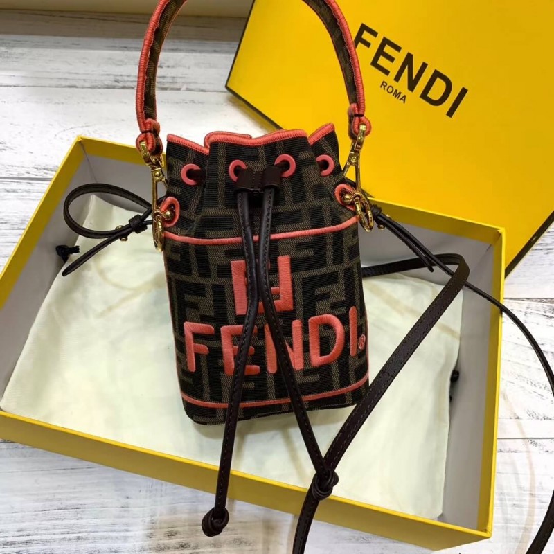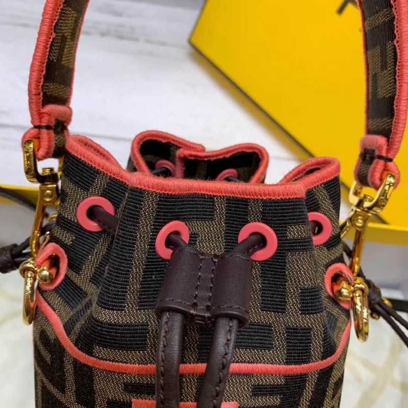 Small Mon Tresor bucket bag with drawstring fastening and metal decorations in the Fendi logo shape. Two detachable shoulder straps, one long and one short, to wear the bag over the shoulder or cross-body. Made of jacquard fabric with macro FF motif. Decorated with Fendi Label motif and edges in neon yellow satin-stitch embroidery. Gold-finish metalware.