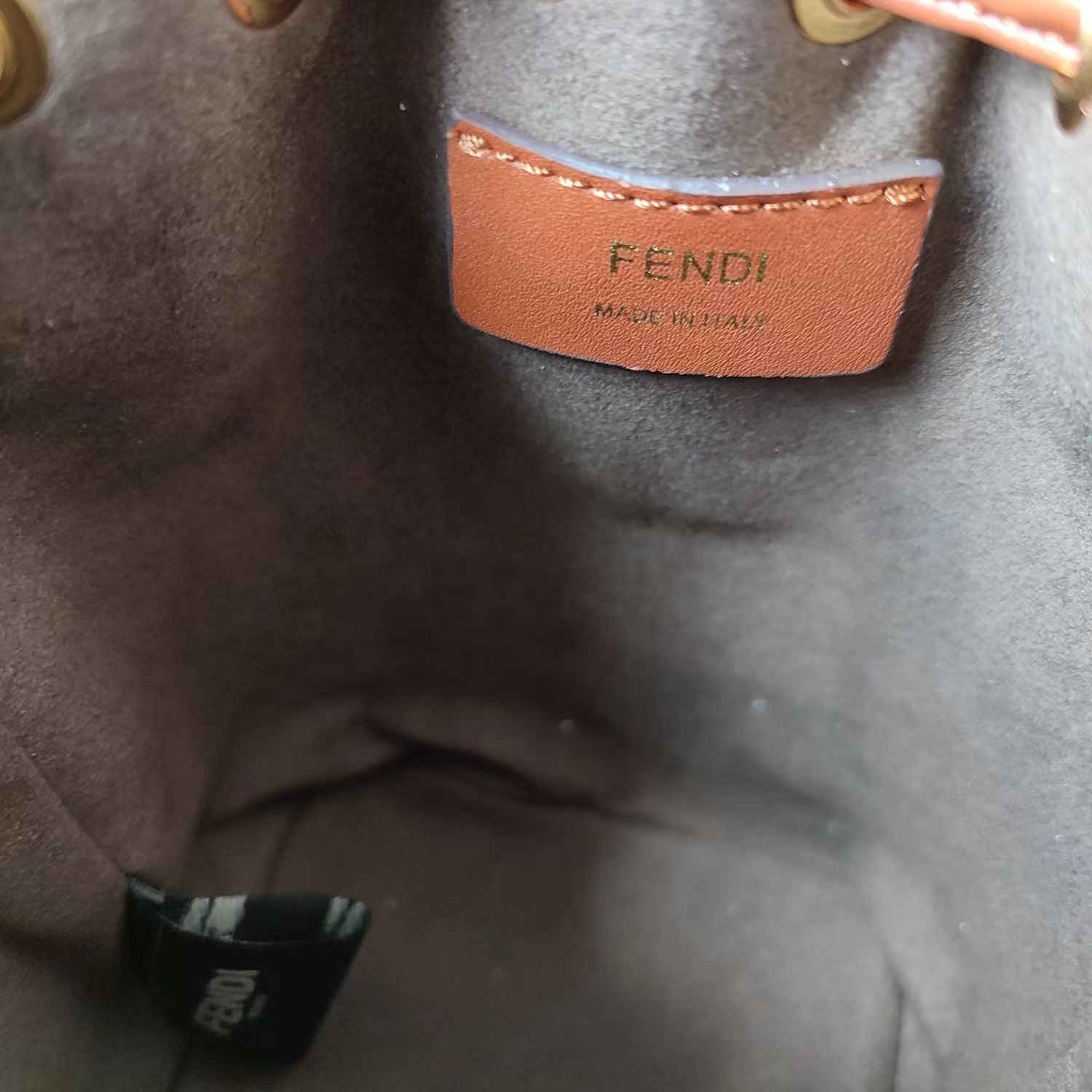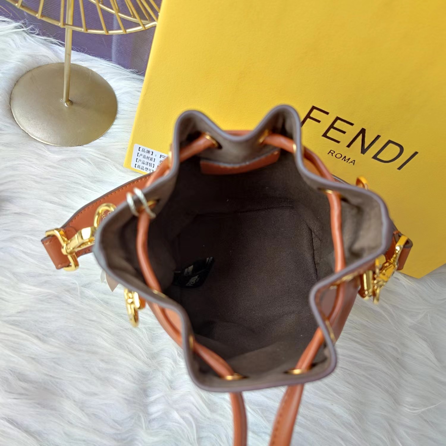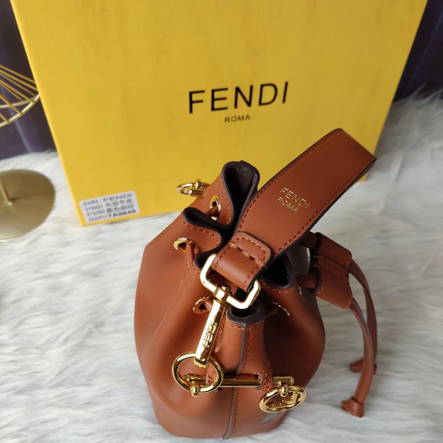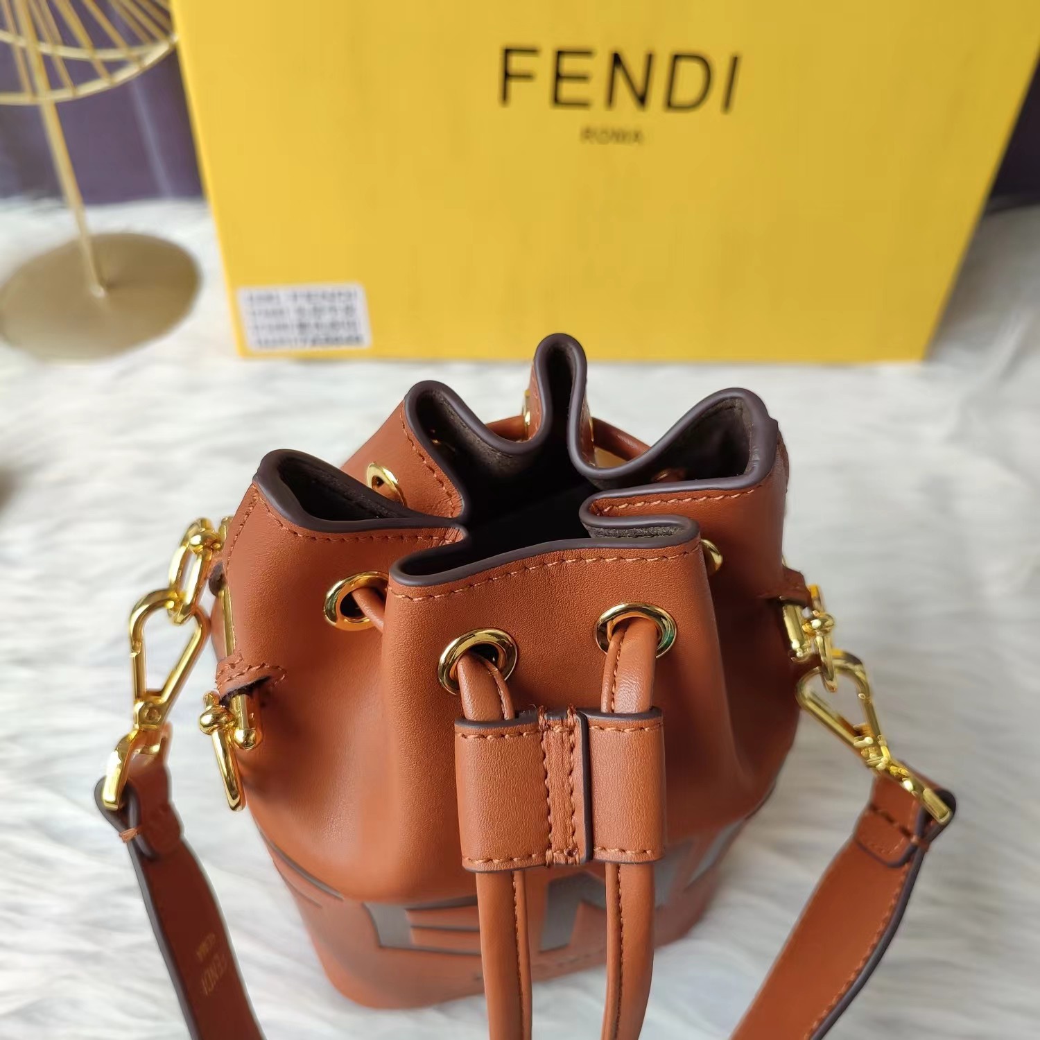 Small Mon Tresor bucket bag with drawstring fastening and metal decorations in the Fendi logo shape. Two detachable shoulder straps, one long and one short, to wear the bag over the shoulder or cross-body. Made of white leather with heat-stamped FENDI ROMA motif. Gold-finish metalware.