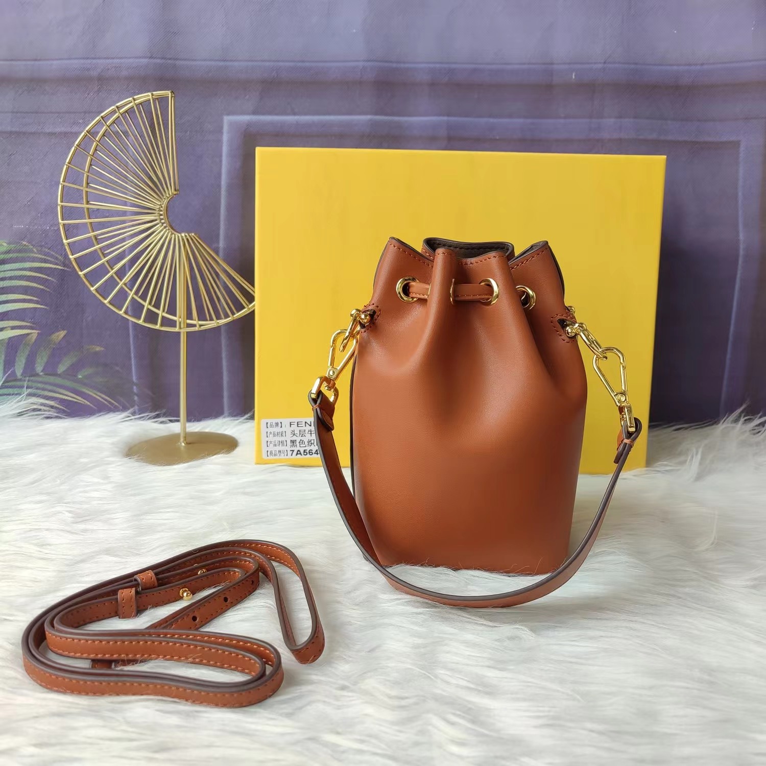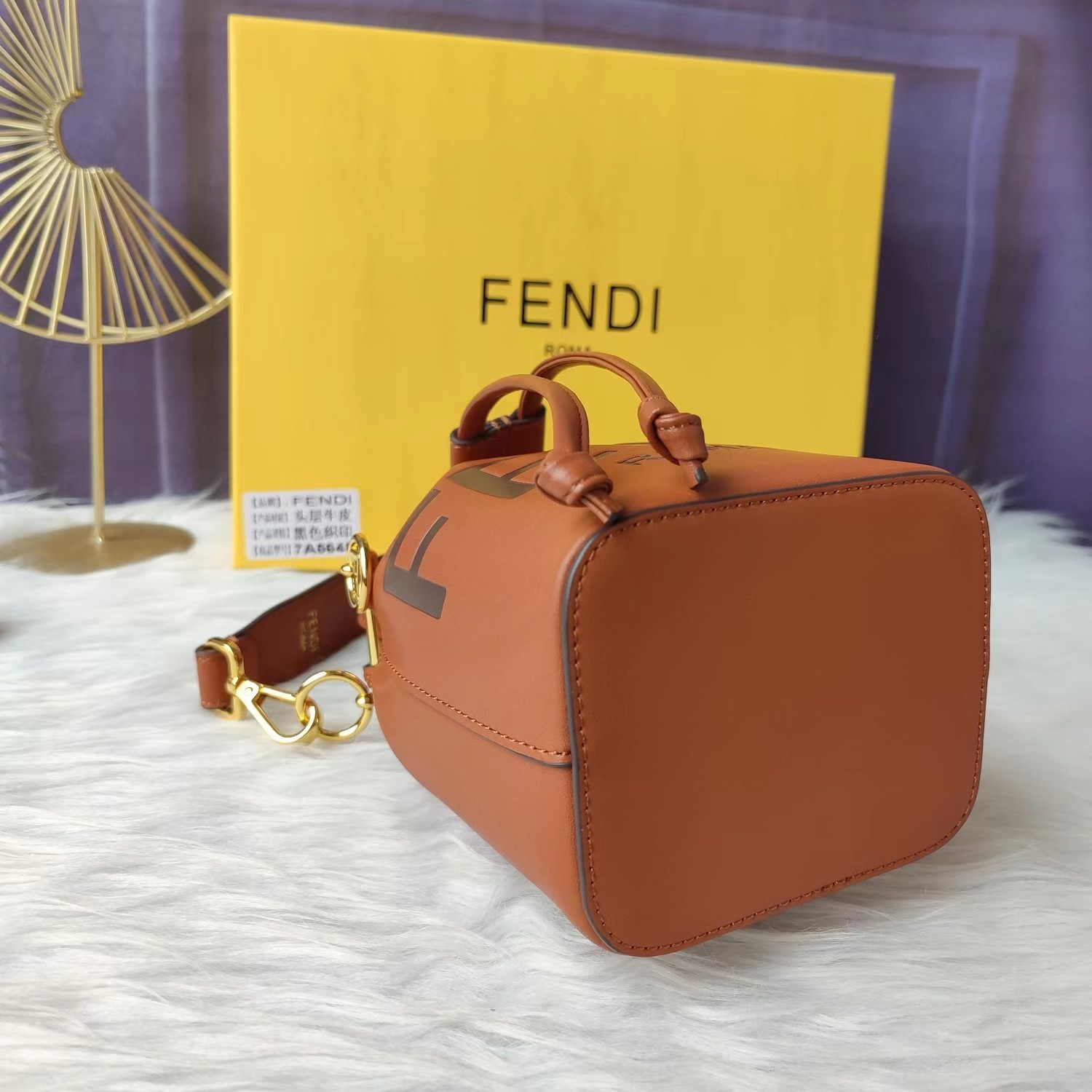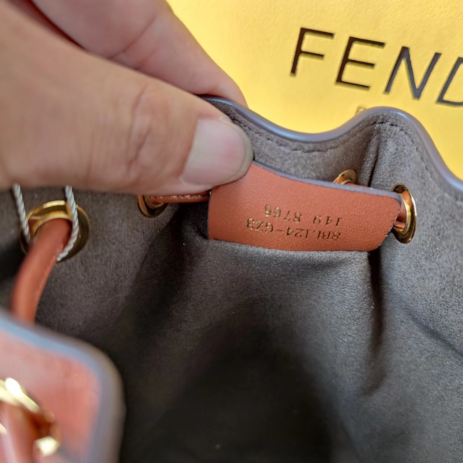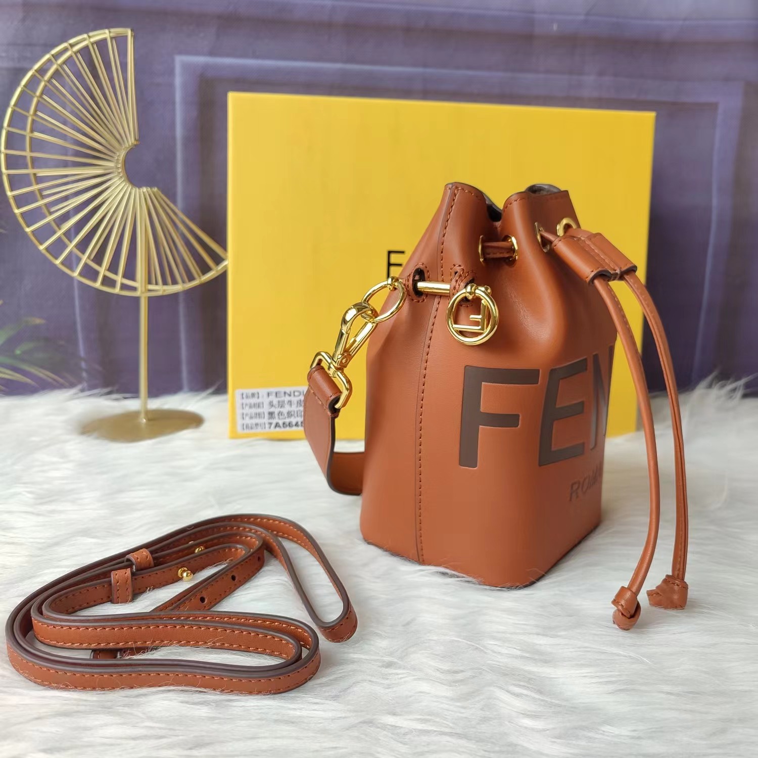 Small Mon Tresor bucket bag with drawstring fastening and metal decorations in the Fendi logo shape. Two detachable shoulder straps, one long and one short, to wear the bag over the shoulder or cross-body. Made of white leather with heat-stamped FENDI ROMA motif. Gold-finish metalware.