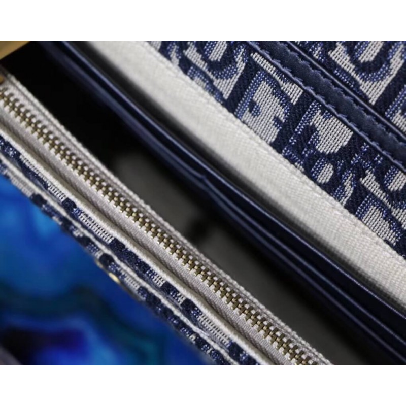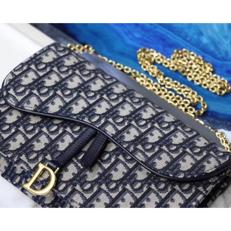 Large Saddle Wallet on Chain clutch in blue Dior Oblique jacquard canvas with blue calfskin leather.