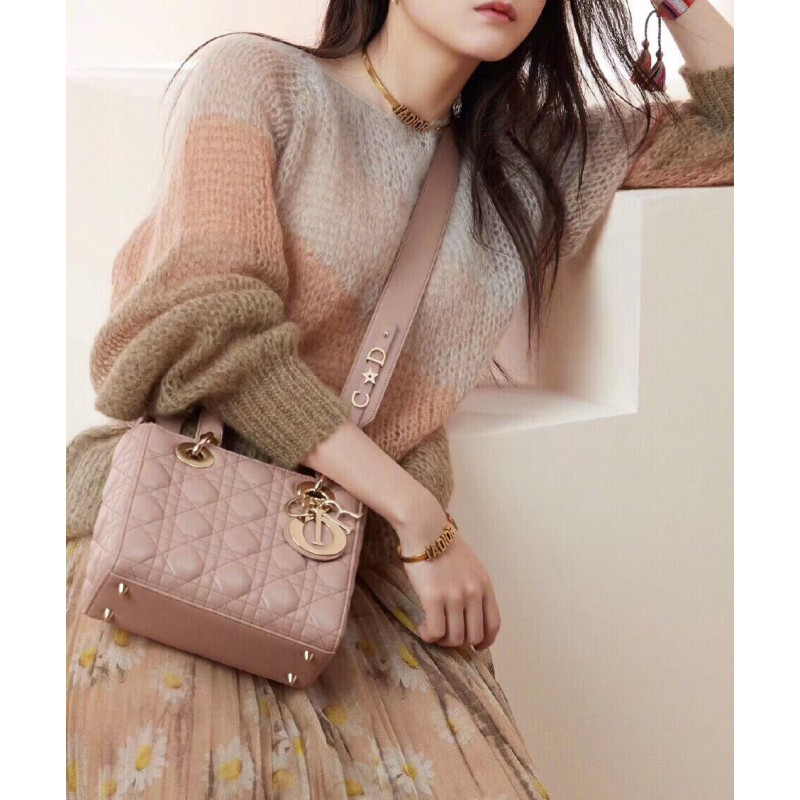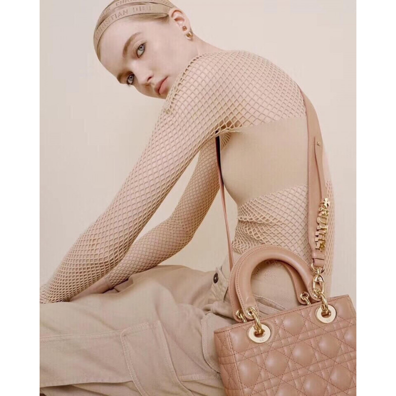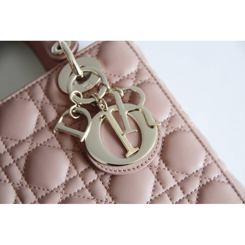 My ABCDior bag in blushed powder Cannage lambskin, wide customizable shoulder strap with 3 badges included. Option to add up to a total of 6 badges.