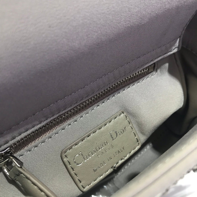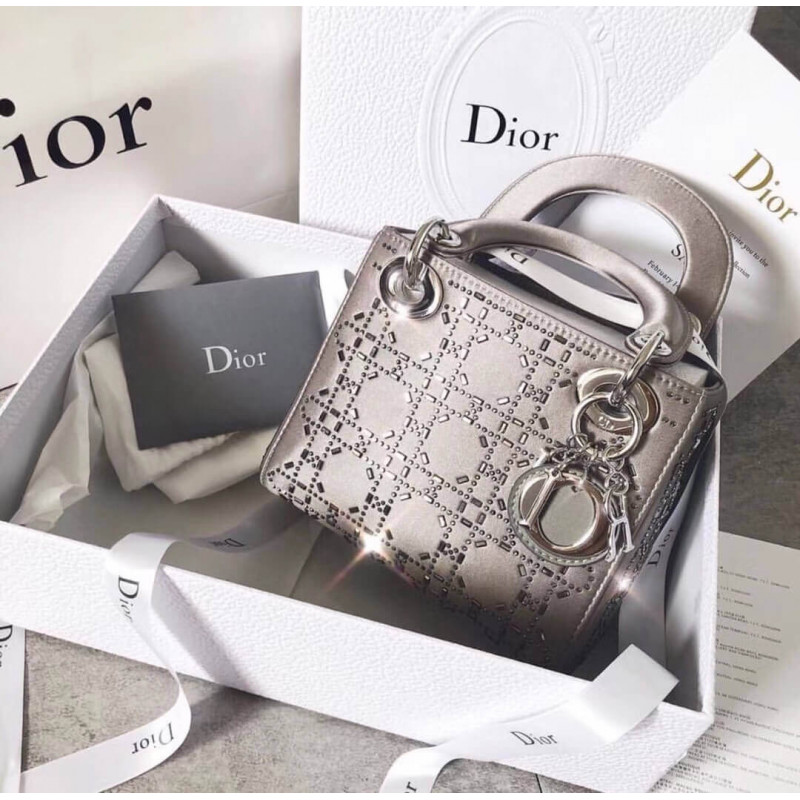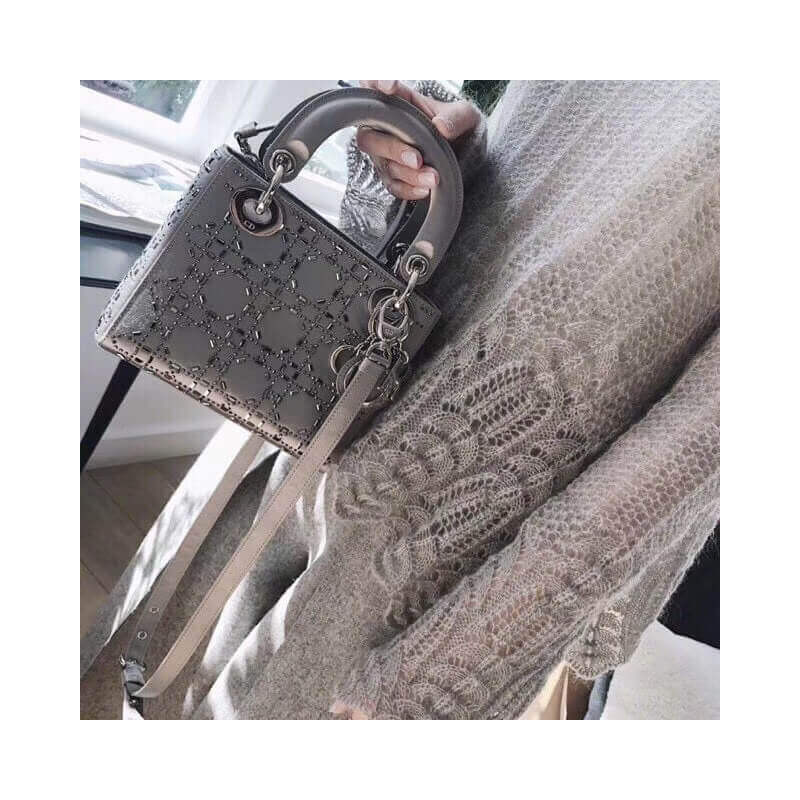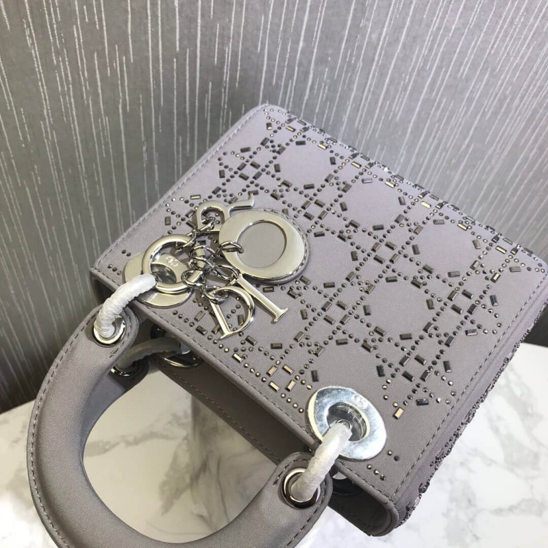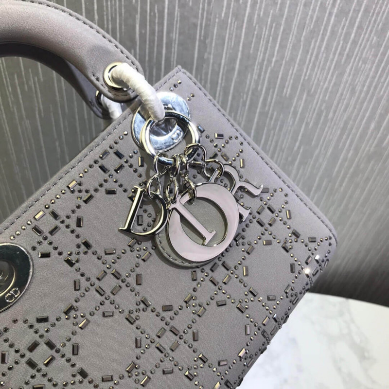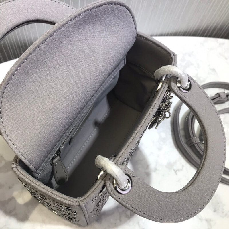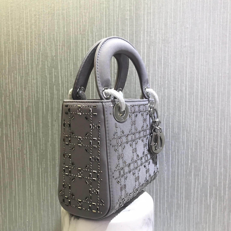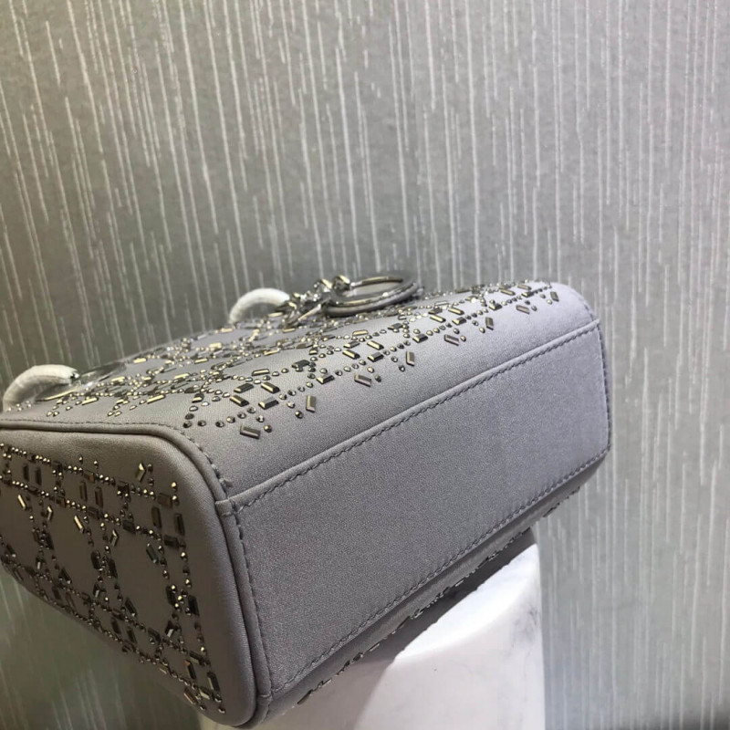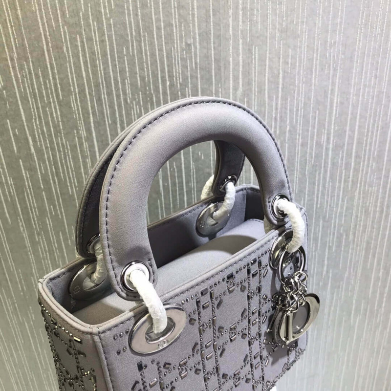 Mini Lady Dior bag in gray Cannage satin with rhinestones, detachable chain.