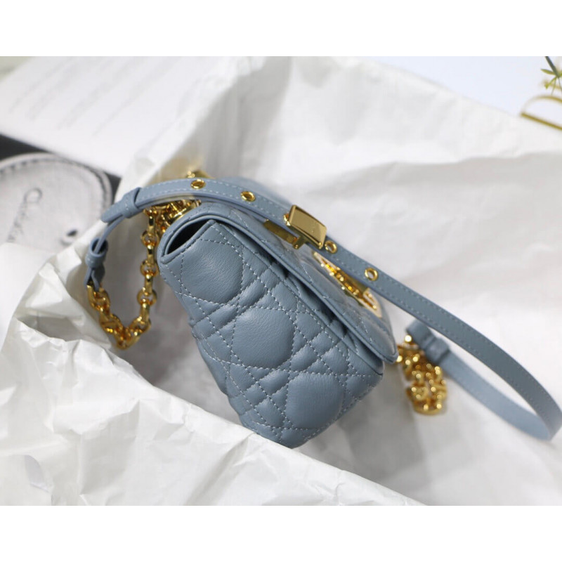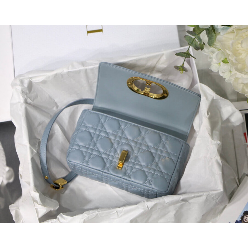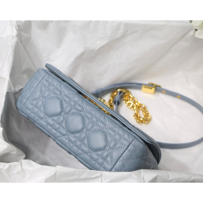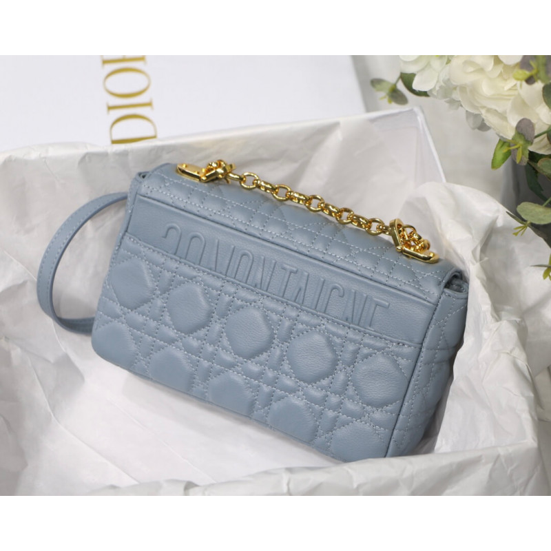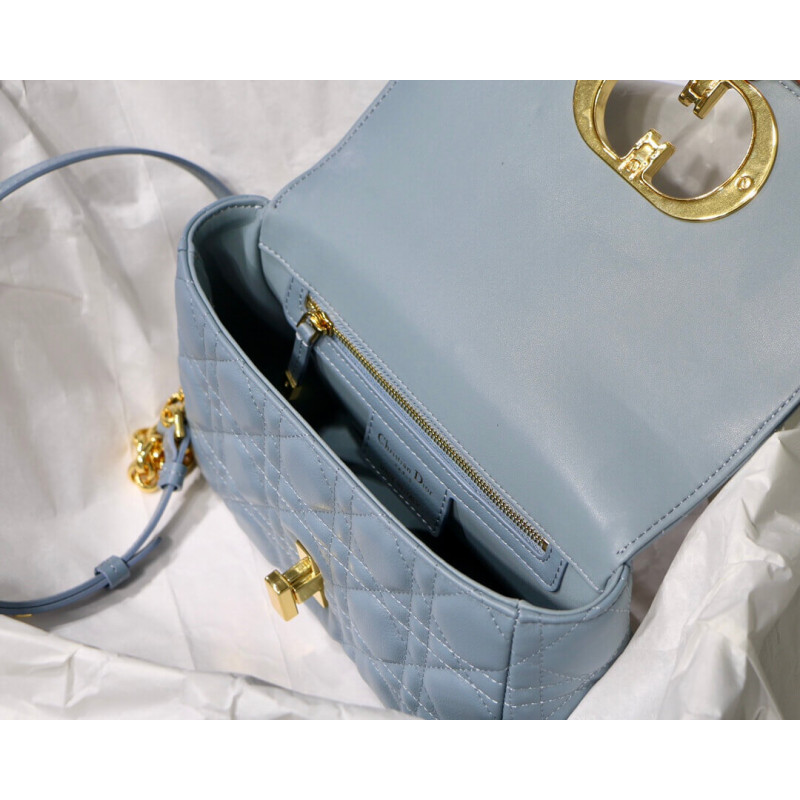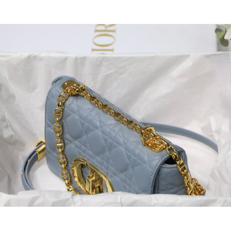 The new Dior Caro bag, in black calfskin, is adorned with the instantly recognizable Cannage stitching. The supple bag features a flap with an antique gold-finish metal twist CD clasp, inspired by the seal of a Christian Dior perfume bottle. The removable signature CD chain link shoulder strap can be replaced with a wide embroidered strap, allowing the small style to be worn during both the day and the evening for a modern, elegant look.