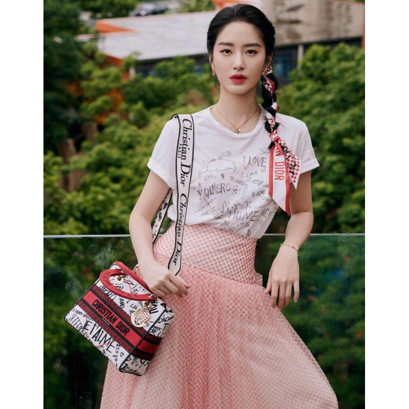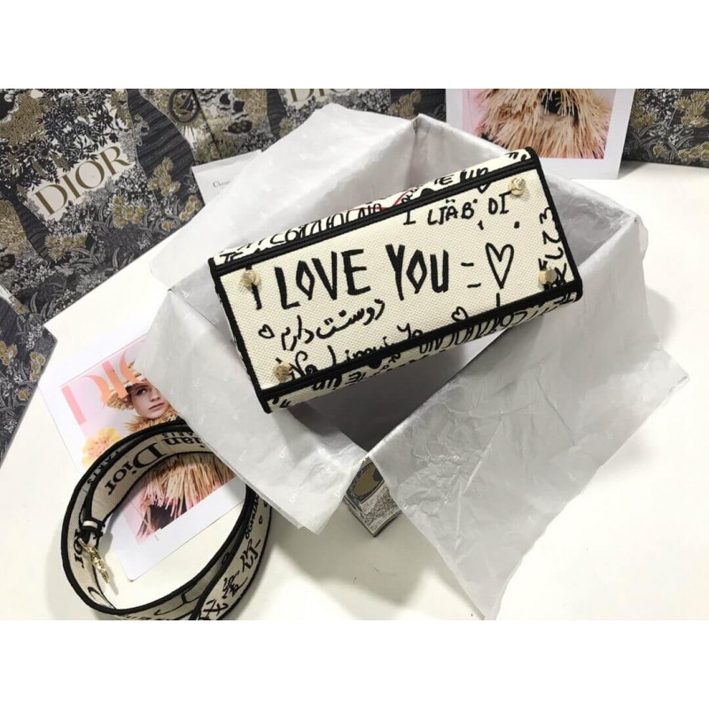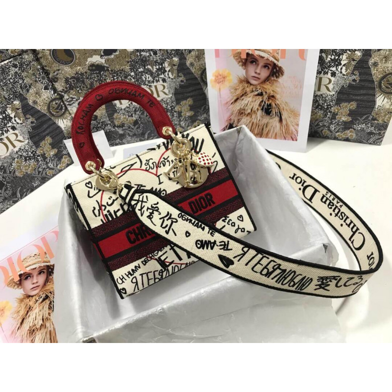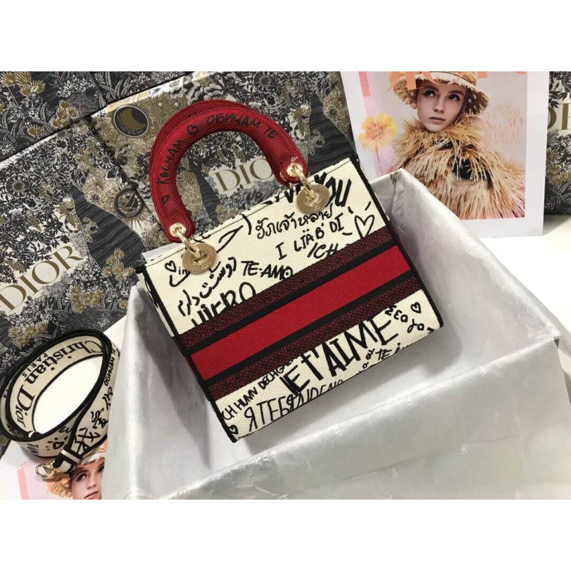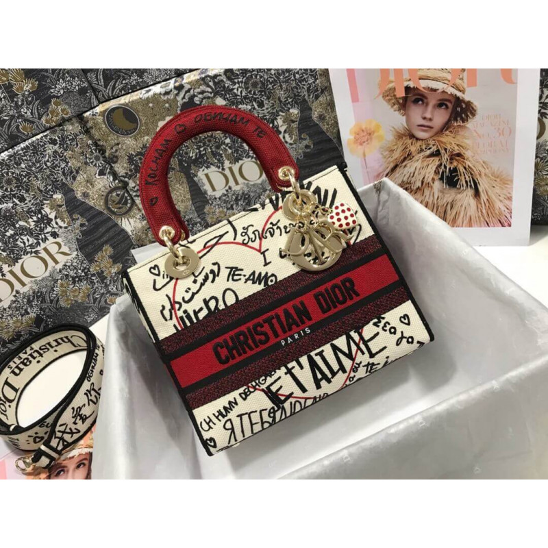 The Lady D-Lite handbag epitomizes Dior s vision of elegance and beauty. Part of the Dioramour capsule collection, this sleek and feminine latte-colored bag is fully embroidered with the Dioramour Graffiti motif, stating the words ‘I love you’ in 38 different languages. A white enamel heart charm with red polka dots joins the pale gold signature D. I. O. R. charms in embellishing the classic silhouette. This medium style has a large, fully embroidered and removable shoulder strap and can be worn many ways.