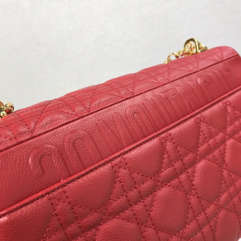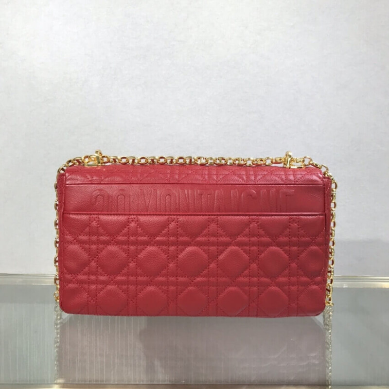 The new Dior Caro bag boasts Cannage stitching on black calfskin, showcasing the instantly recognizable quilted texture. The supple bag features a flap with the twist CD clasp, inspired by the seal of a Christian Dior perfume bottle, styled in antique gold-finish metal. The removable signature CD chain link shoulder strap can be replaced with a wide embroidered strap, allowing the large style to be worn during both the day and the evening for a modern, elegant look.