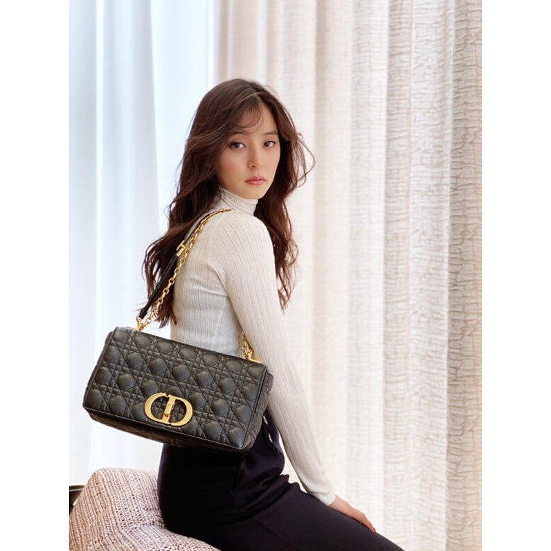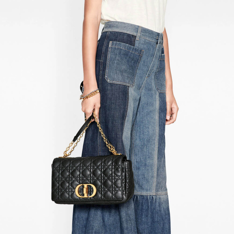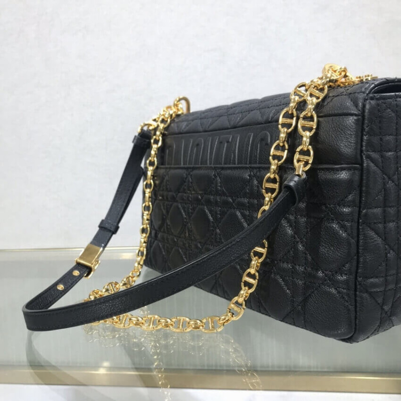 The new Dior Caro bag boasts Cannage stitching on black calfskin, showcasing the instantly recognizable quilted texture. The supple bag features a flap with the twist CD clasp, inspired by the seal of a Christian Dior perfume bottle, styled in antique gold-finish metal. The removable signature CD chain link shoulder strap can be replaced with a wide embroidered strap, allowing the large style to be worn during both the day and the evening for a modern, elegant look.