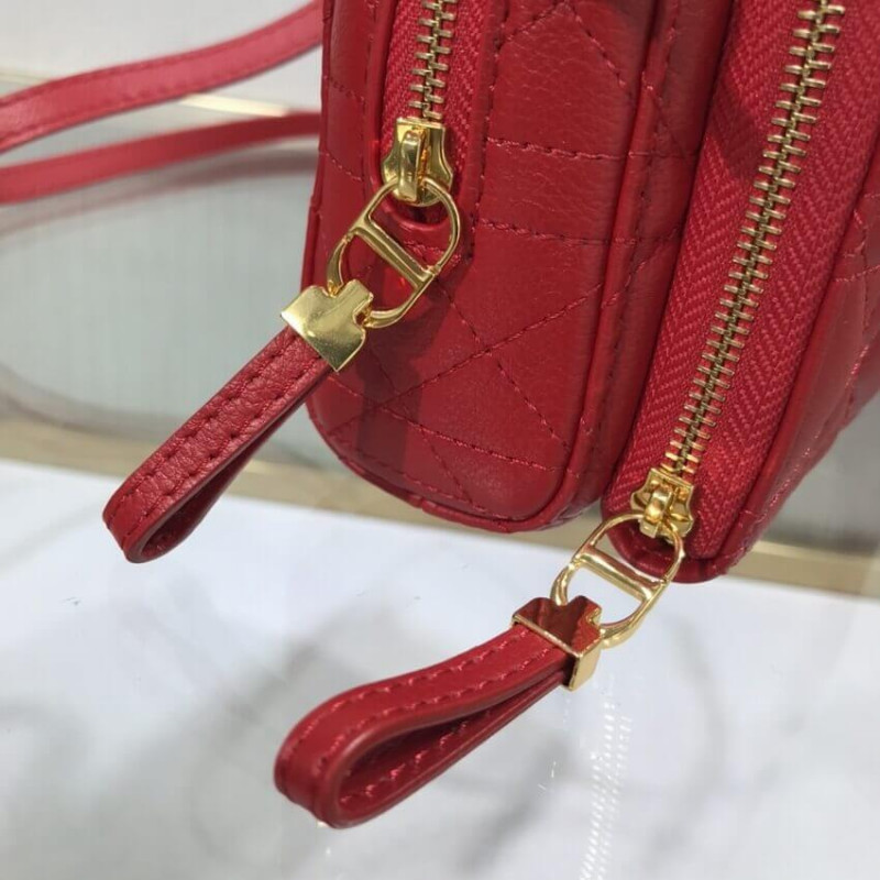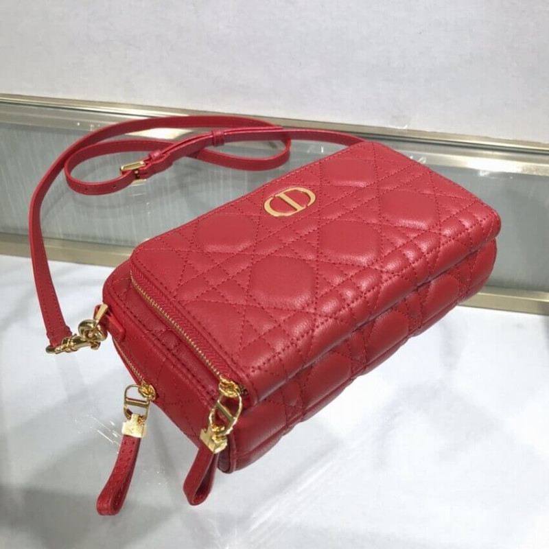 The Dior Caro double pouch, both spacious and compact, is ideal for daily life. Crafted in black calfskin, it is embellished with hallmark Cannage topstitching and features two large compartments, a zipped pocket and two card slots to hold all the essentials. The removable and adjustable strap allows it to be carried by hand, worn over the shoulder or crossbody.