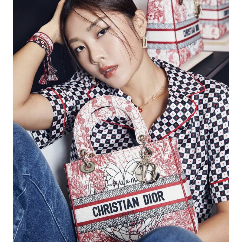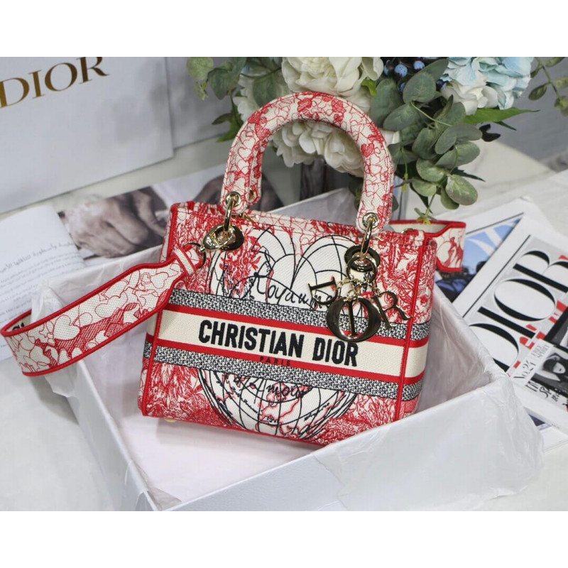 The Lady D-Lite bag, part of the Dioramour capsule, combines classic elegance with House modernity. The style is fully embroidered with a red and white D-Royaume d Amour motif, inspired by the artist Pietro Ruffo. The front features a CHRISTIAN DIOR signature while the thick D.I.O.R. charms in pale gold-finish metal further enhance the silhouette. Equipped with a wide, reversible and removable embroidered shoulder strap, the medium Lady D-Lite bag can be carried by hand, worn over the shoulder or crossbody and may be coordinated with other Dioramour creations.