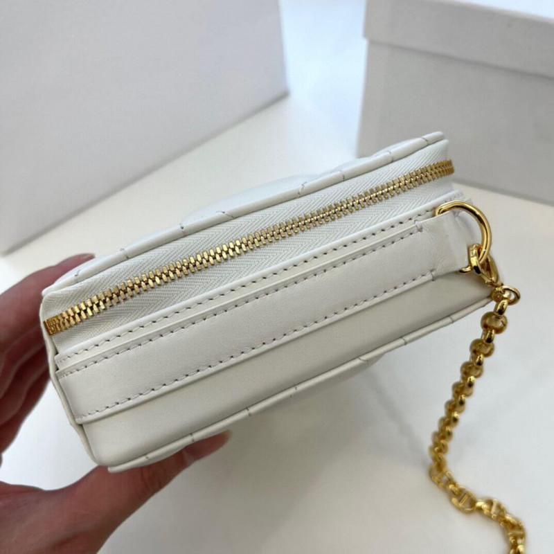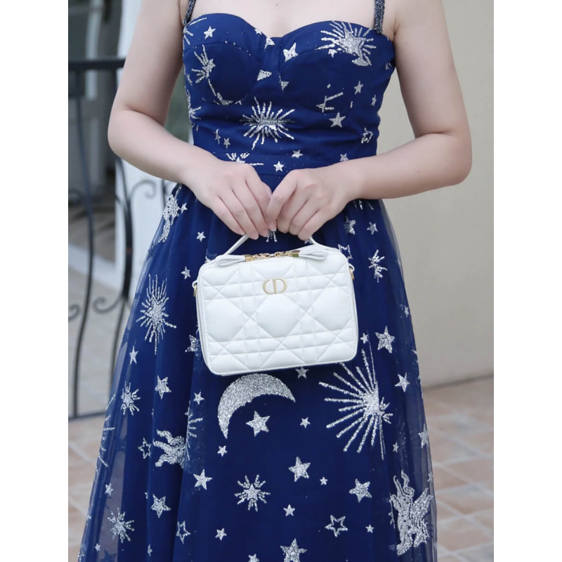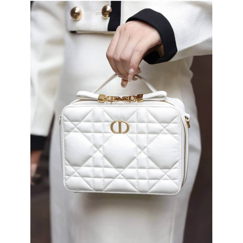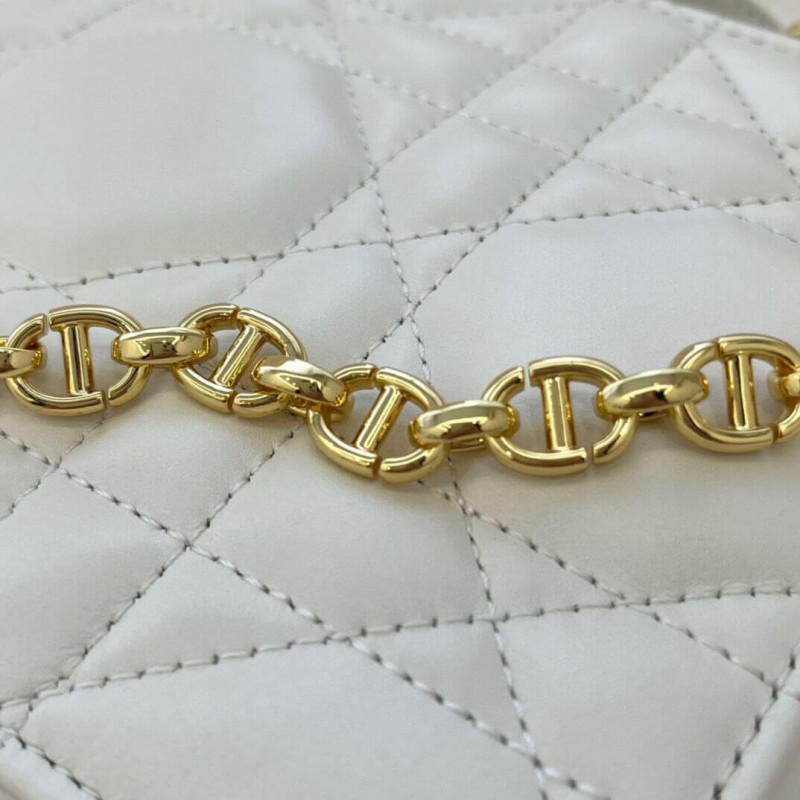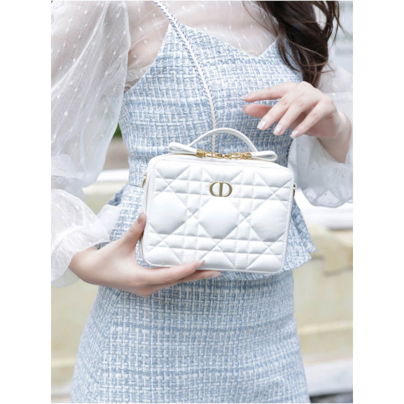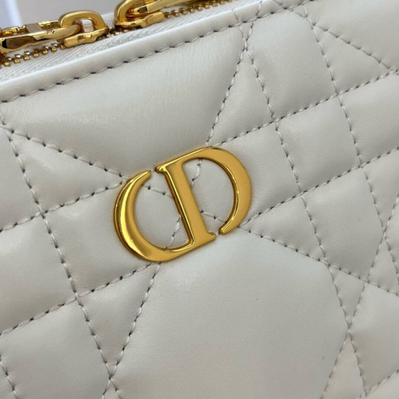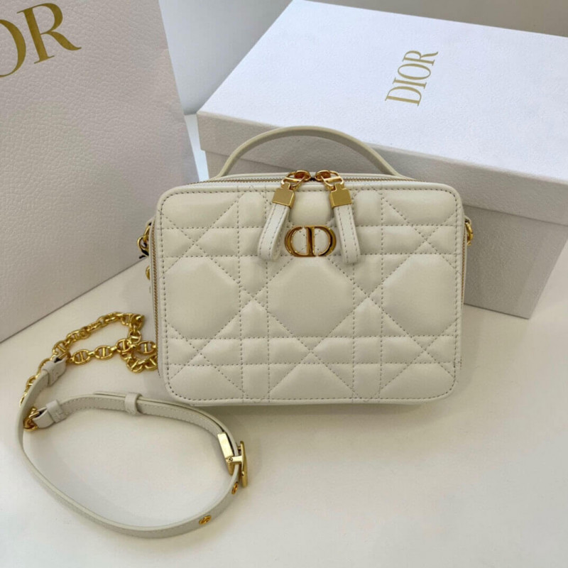New this season, Maria Grazia Chiuri s Dior Caro box bag with chain is a modern creation. Crafted in latte calfskin, it stands out with a unique Macrocannage quilted effect and a spacious compartment, including three card slots, to accommodate all the daily essentials. The removable chain strap features a leather insert for comfortable and adjustable wear, either over the shoulder or crossbody, while the handle allows it to be carried by hand.