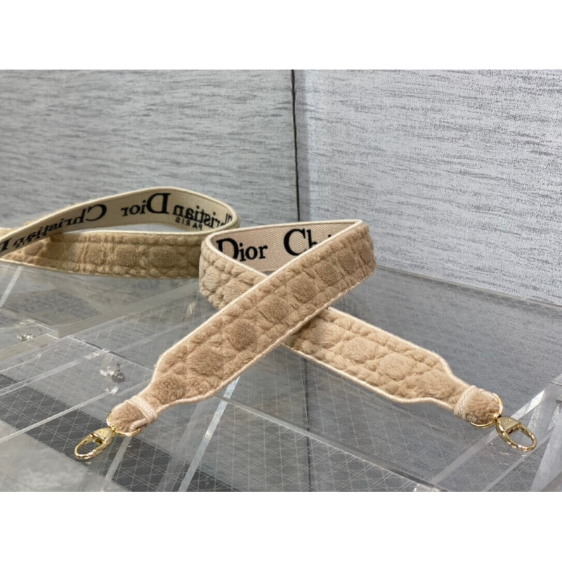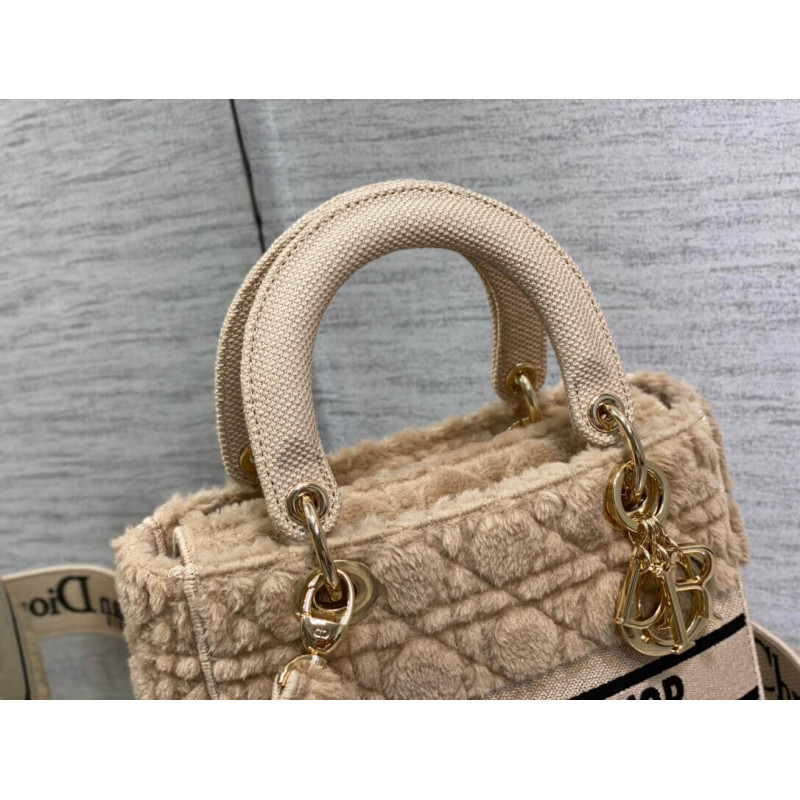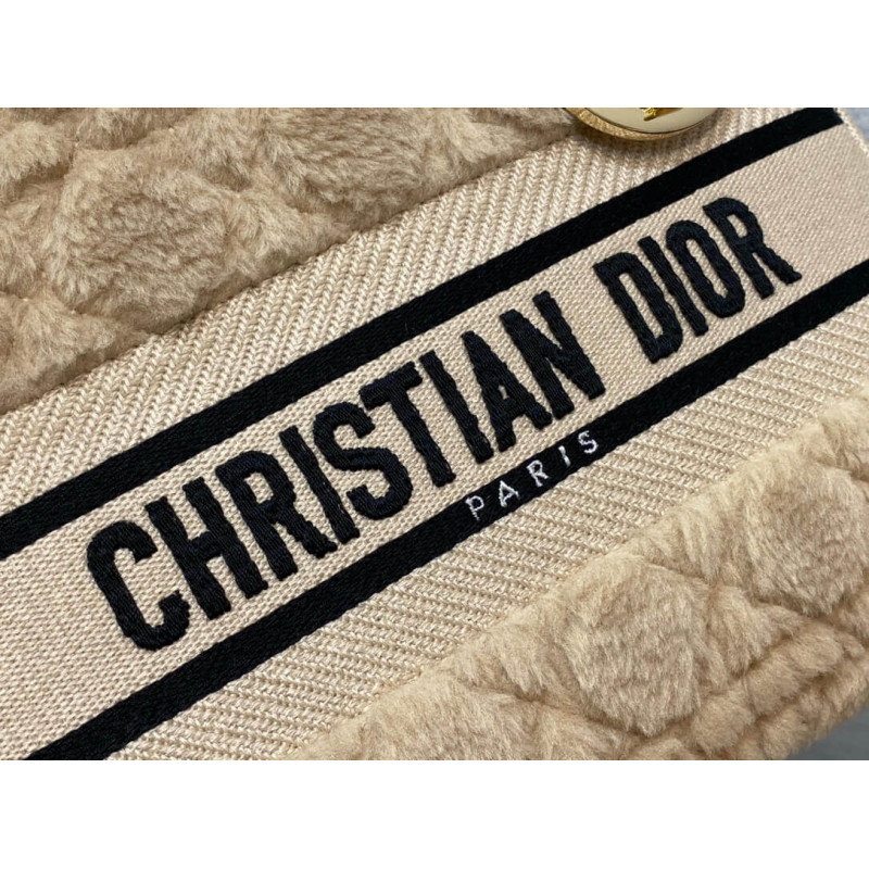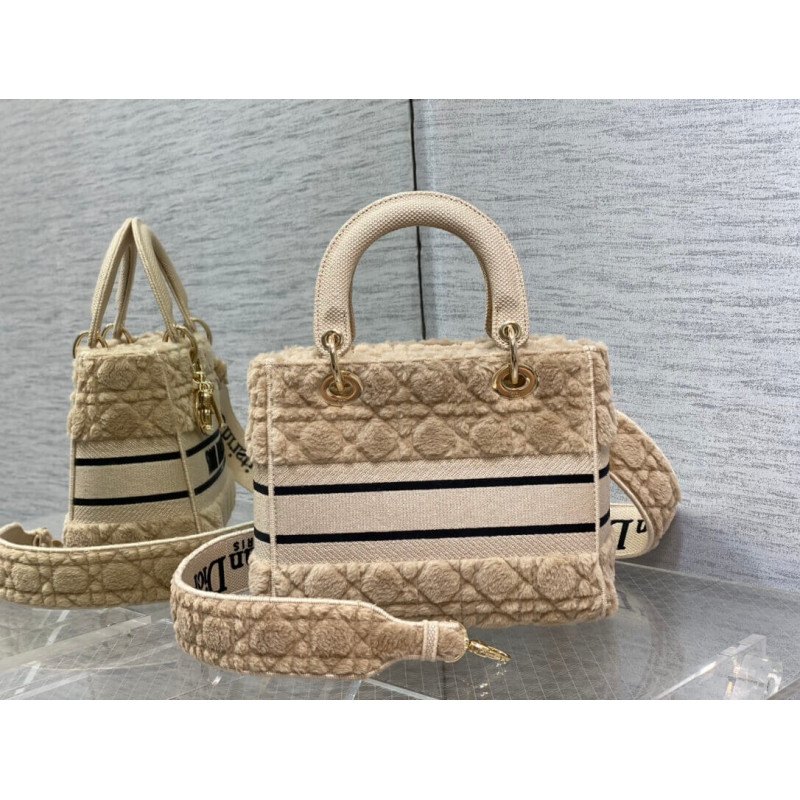 The Lady D-Lite bag combines classic elegance with House modernity. The latte shearling style showcases the Cannage motif. A CHRISTIAN DIOR PARIS signature adorns the front, while D.I.O.R. charms in pale gold-finish metal further enhance and highlight the silhouette. Featuring a wide, removable and reversible embroidered shoulder strap, the medium Lady D-Lite bag can be carried by hand or worn crossbody.
