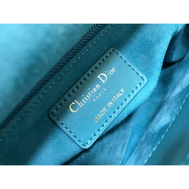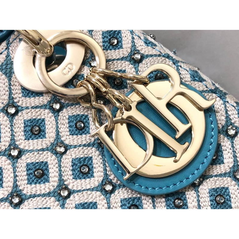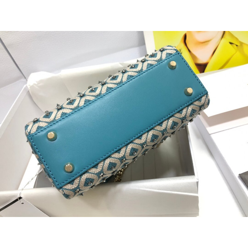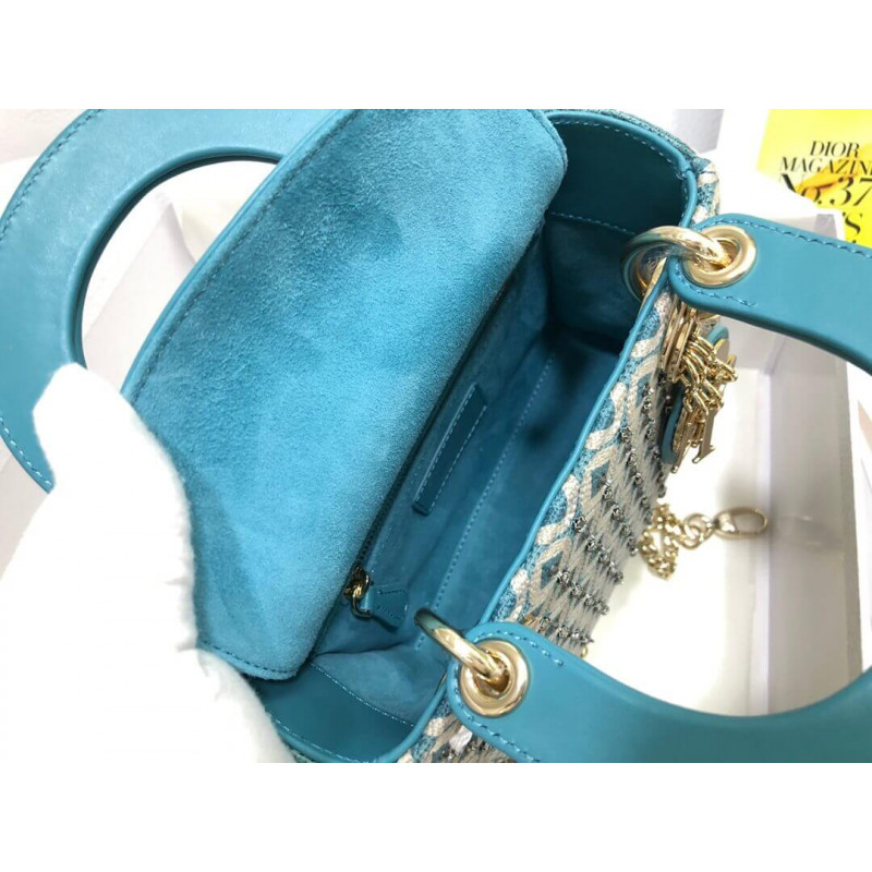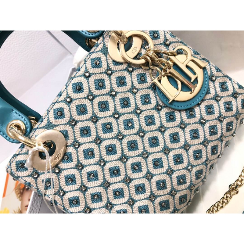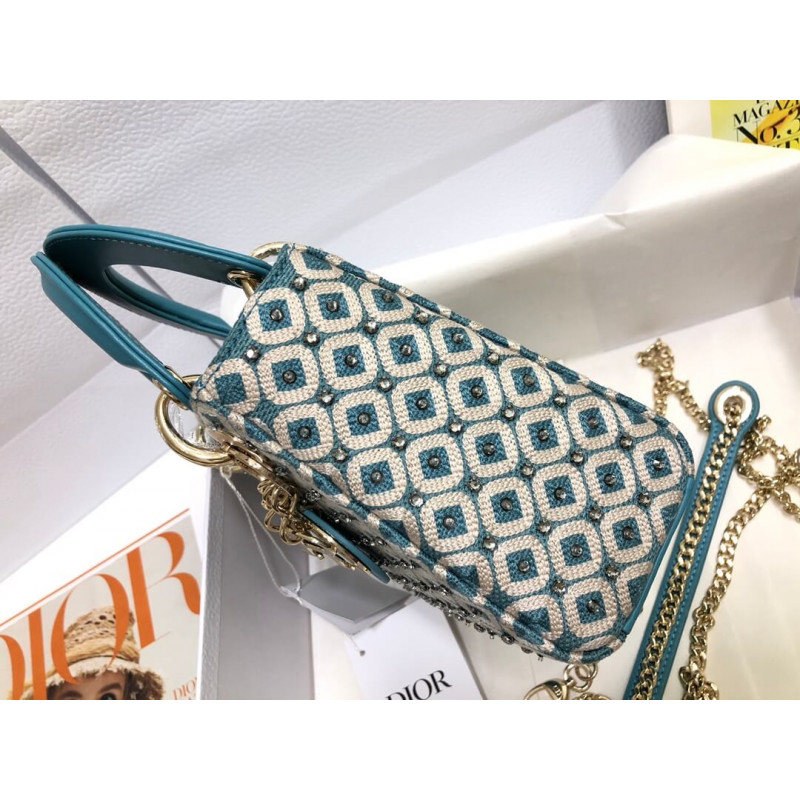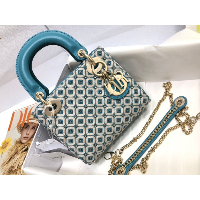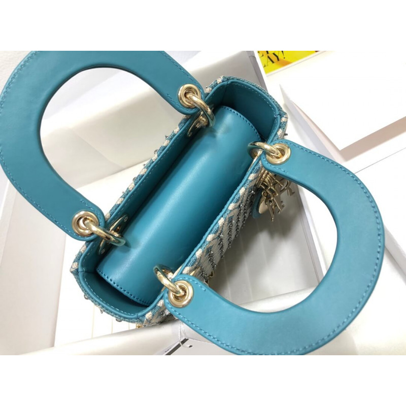 Lady Dior Mini Azure Blue Honeycomb Embroidery Bag M0505 With Two-Tone Thread And Rhinestones