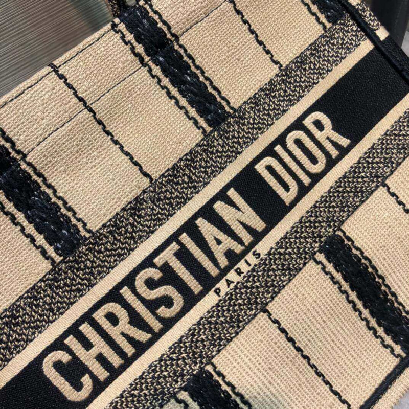The Dior Book Tote, an original style introduced by Christian Dior s creative director, Maria Grazia Chiuri, has become a staple of the Dior aesthetic. Ideally designed to carry all your daily essentials, the small shape is fully embroidered with lurex portraying a bayadère print, with the debossed Christian Dior signature on the front. This carryall is a perfect example of the Dior savoir-faire and it may be worn with other small accessories or the Mitzah scarf for a complete look.