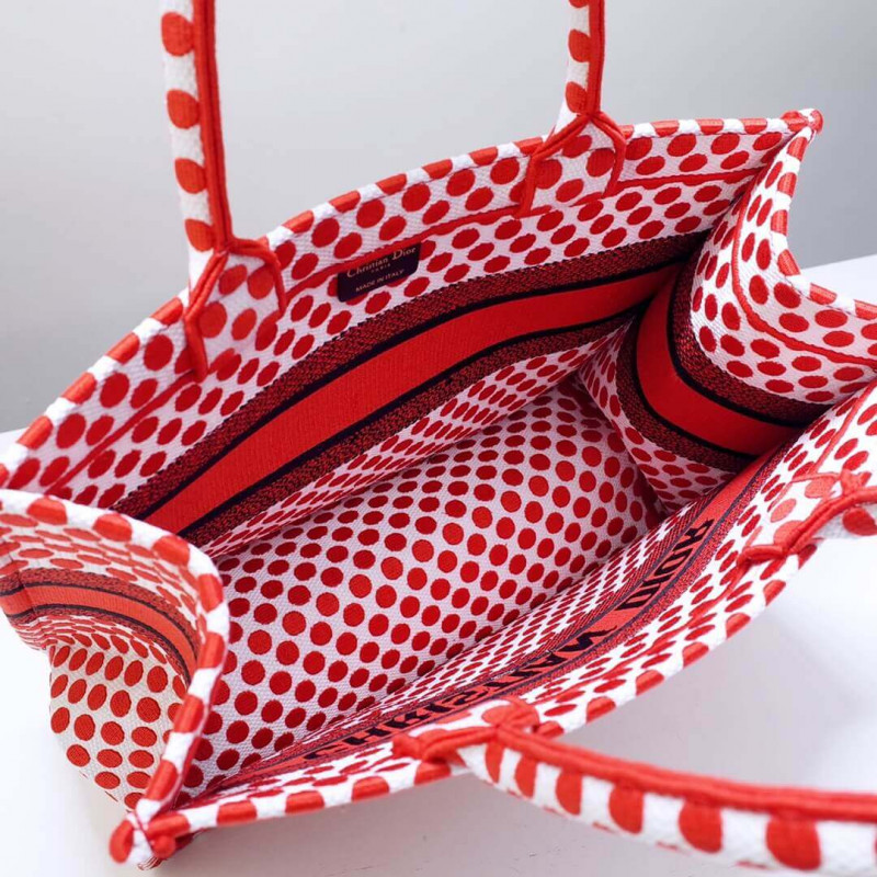 The Dior Book Tote, an original style introduced by Creative Director Maria Grazia Chiuri, has become a staple of the Dior aesthetic. Ideally designed to carry all your daily essentials, the small bag is part of the Dioramour capsule collection, and is embroidered with the red Dior Dots motif. Adorned with the Christian Dior signature, this carryall is a perfect example of the Dior savoir-faire.
