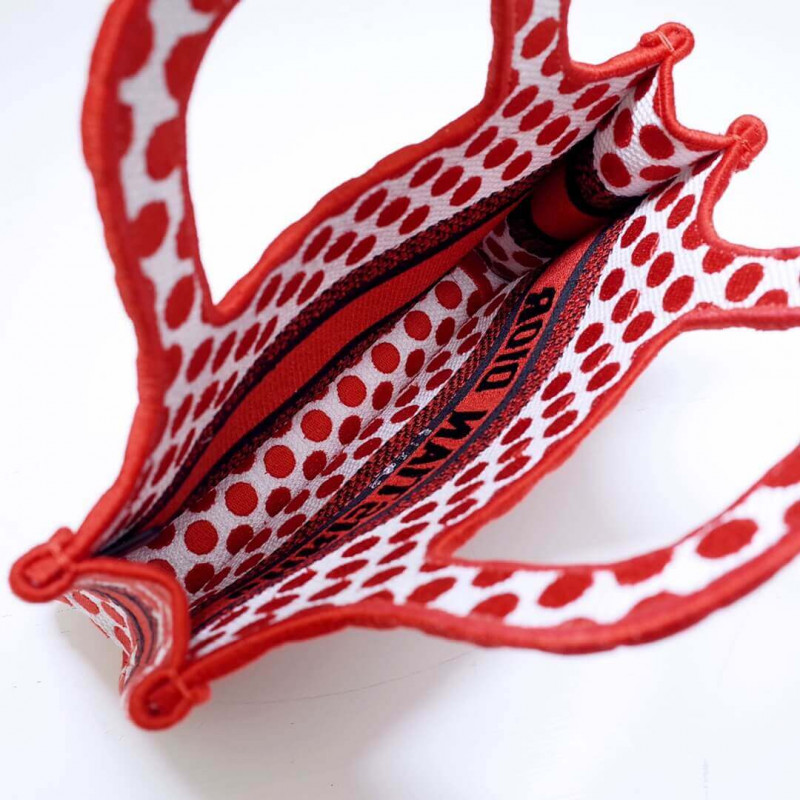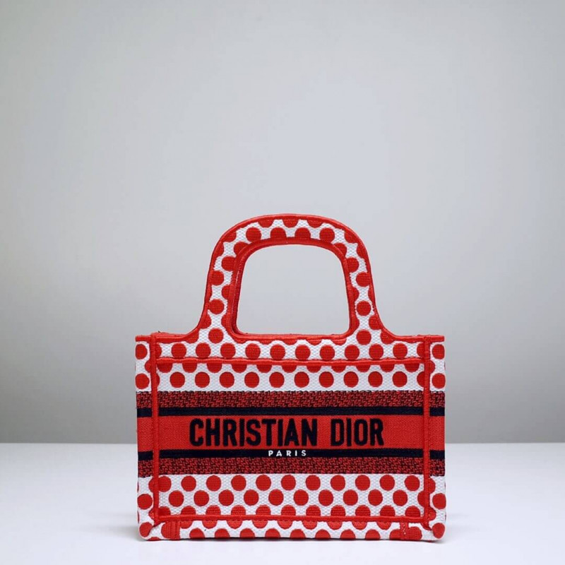 Introduced by Maria Grazia Chiuri, the Dior Book Tote has become a staple of the Dior aesthetic. Designed to carry all your small daily essentials, the mini shape is part of the Dioramour capsule collection. It portrays a fully embroidered red Dior Dots pattern enhanced by a Christian Dior signature. Each dot is meticulously finished by hand, highlighting the Maison s savoir-faire. This Dior Book Tote may be combined with other Dioramour pieces.