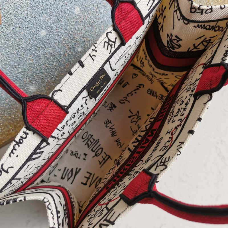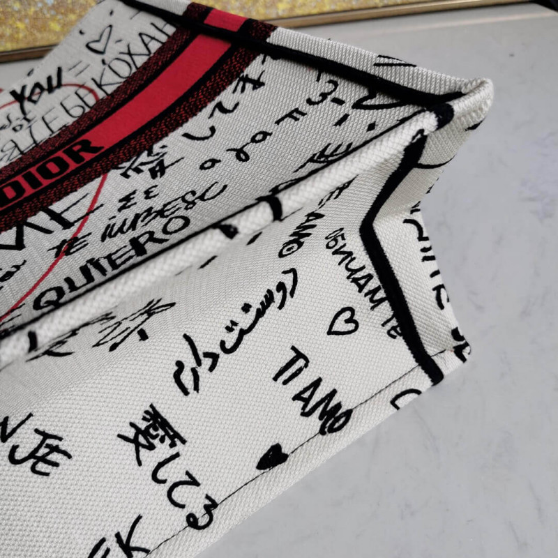 The Dior Book Tote, an original style introduced by Creative Director Maria Grazia Chiuri, has become a staple of the Dior aesthetic. Ideally designed to carry all your daily essentials, the small bag is part of the Dioramour capsule collection, and is fully embroidered with the Dioramour Graffiti motif, stating the words I love you in 38 different languages. Adorned with the Christian Dior signature on the front, this carryall is a perfect example of the Dior savoir-faire.- Christian Dior signature on the front- Can be carried by hand- Dust bag included